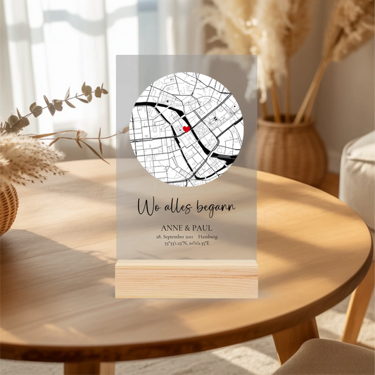 Stadtkarte - Wo alles begann - Acrylschild mit Holzstandfuß