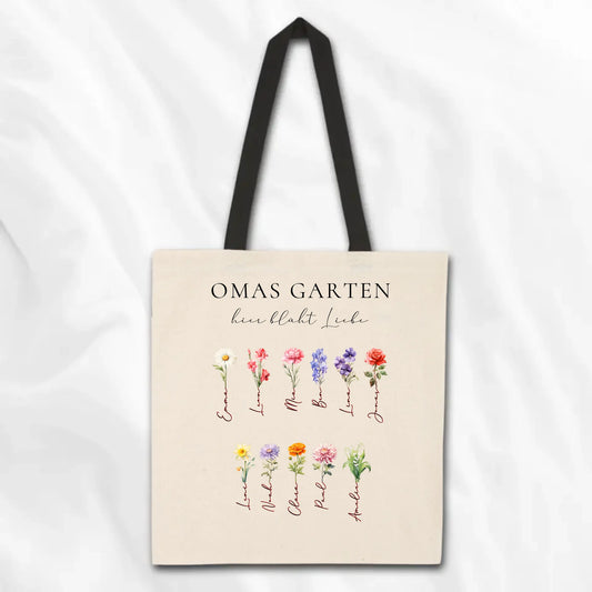 Omas Garten 1-11 Namen mit Geburtsblume - Jutetasche