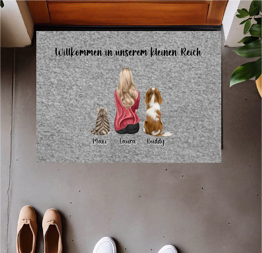Personalisierte Fußmatte Frau mit 2 Haustieren