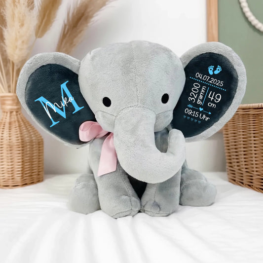 Personalisierter Kuscheltier Elefant mit Namen und Geburtstafel