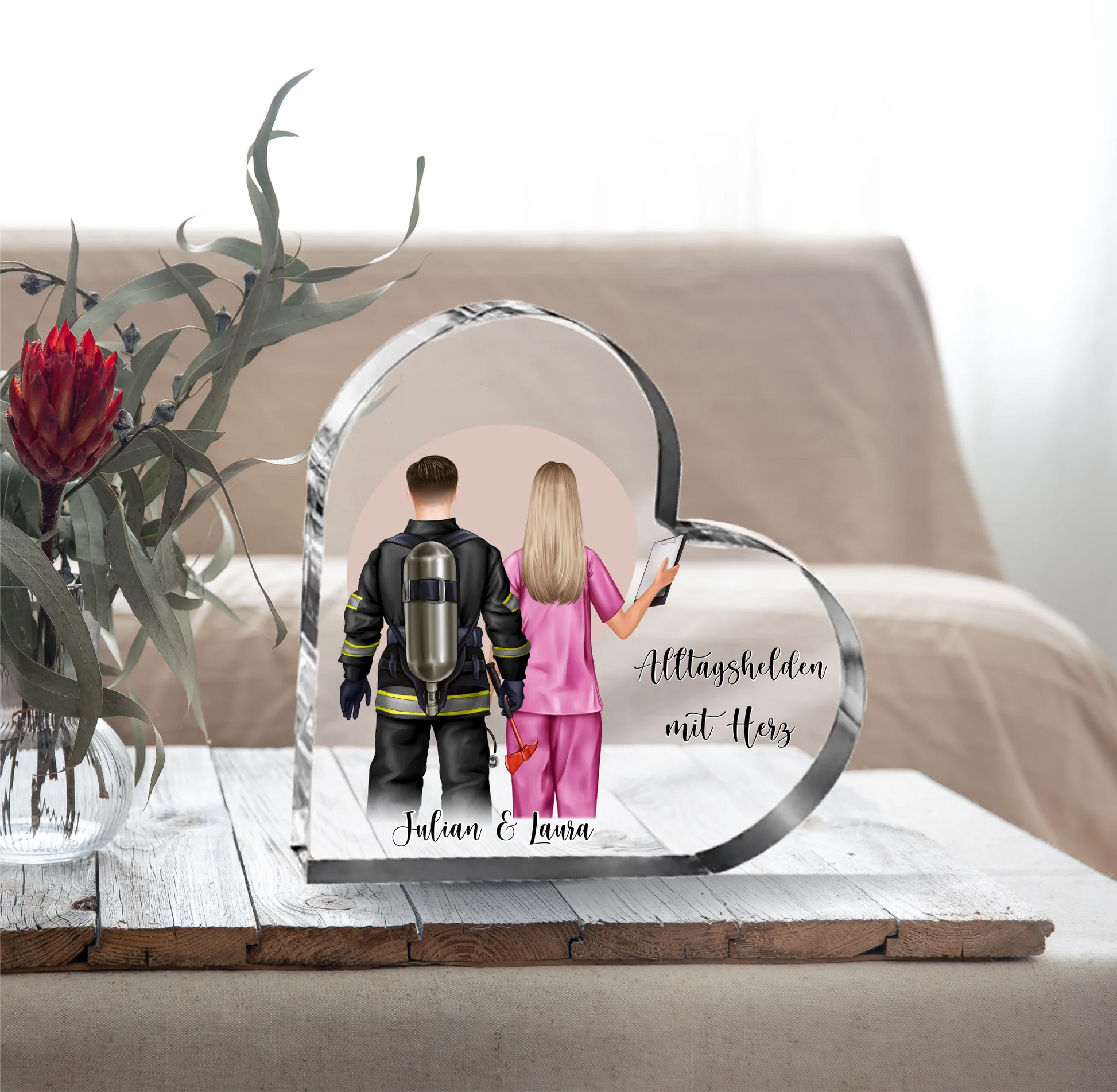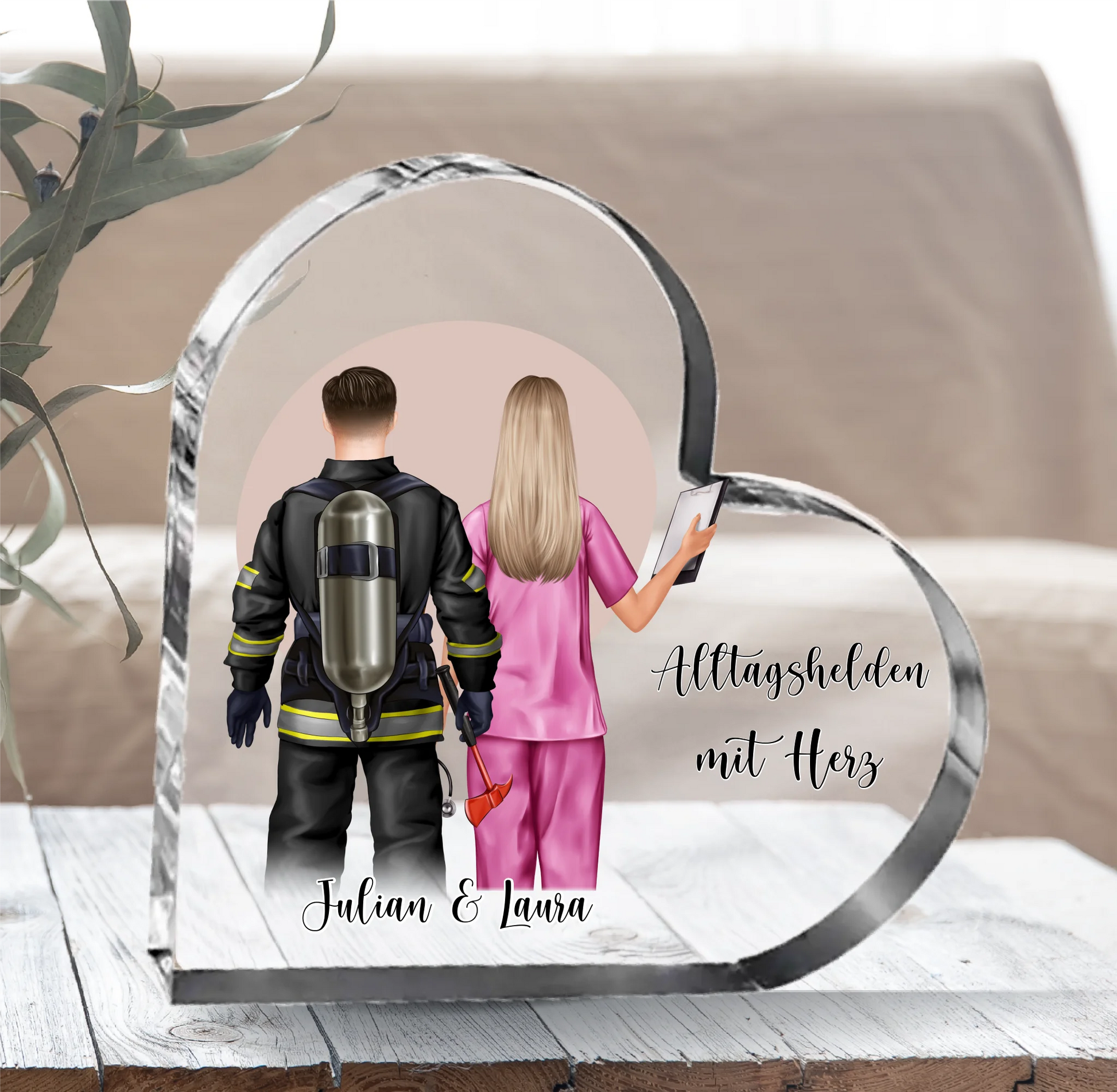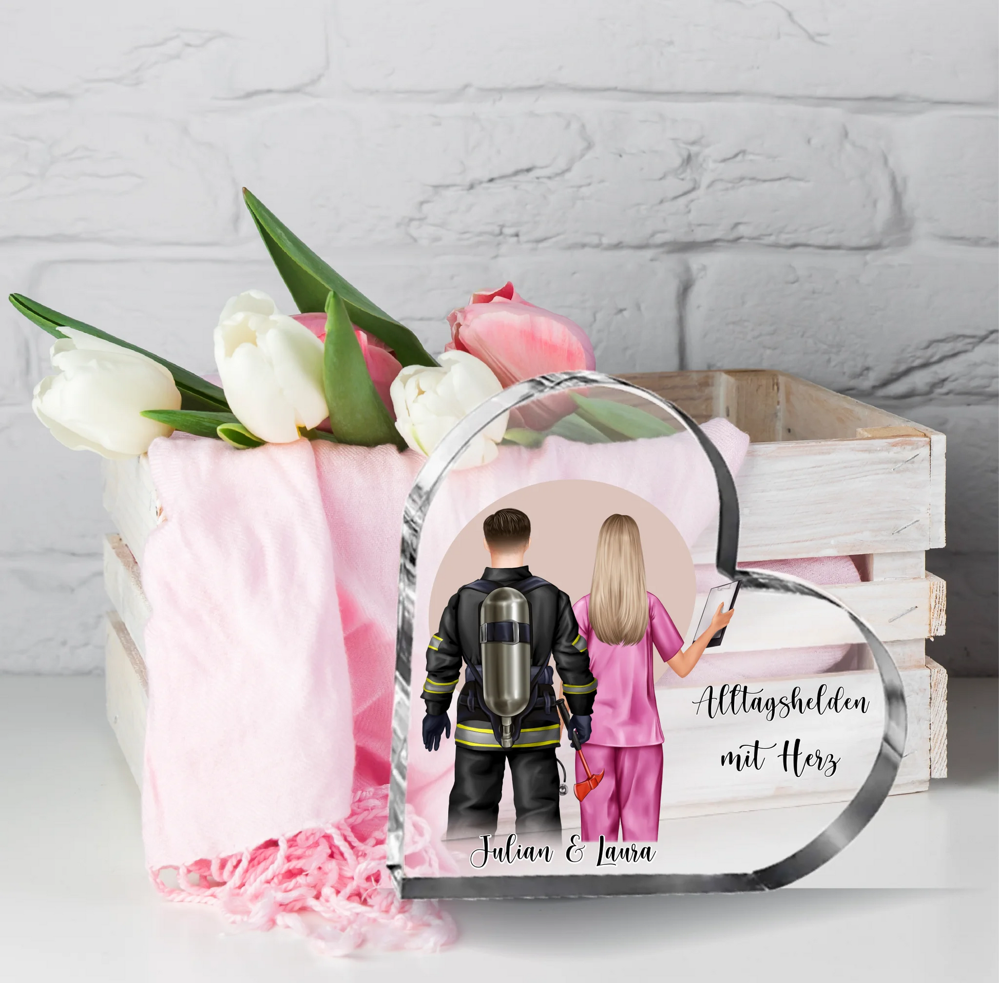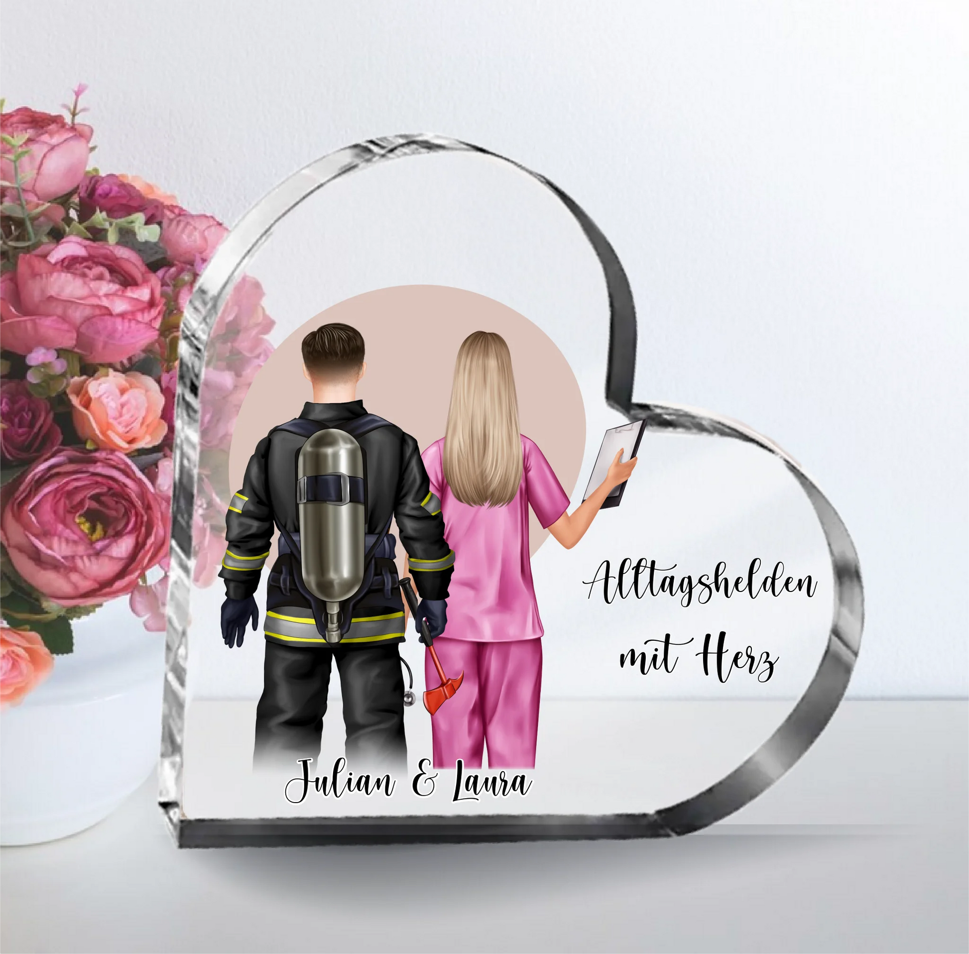 Feuerwehr & Krankenschwester Herz Glasaufsteller