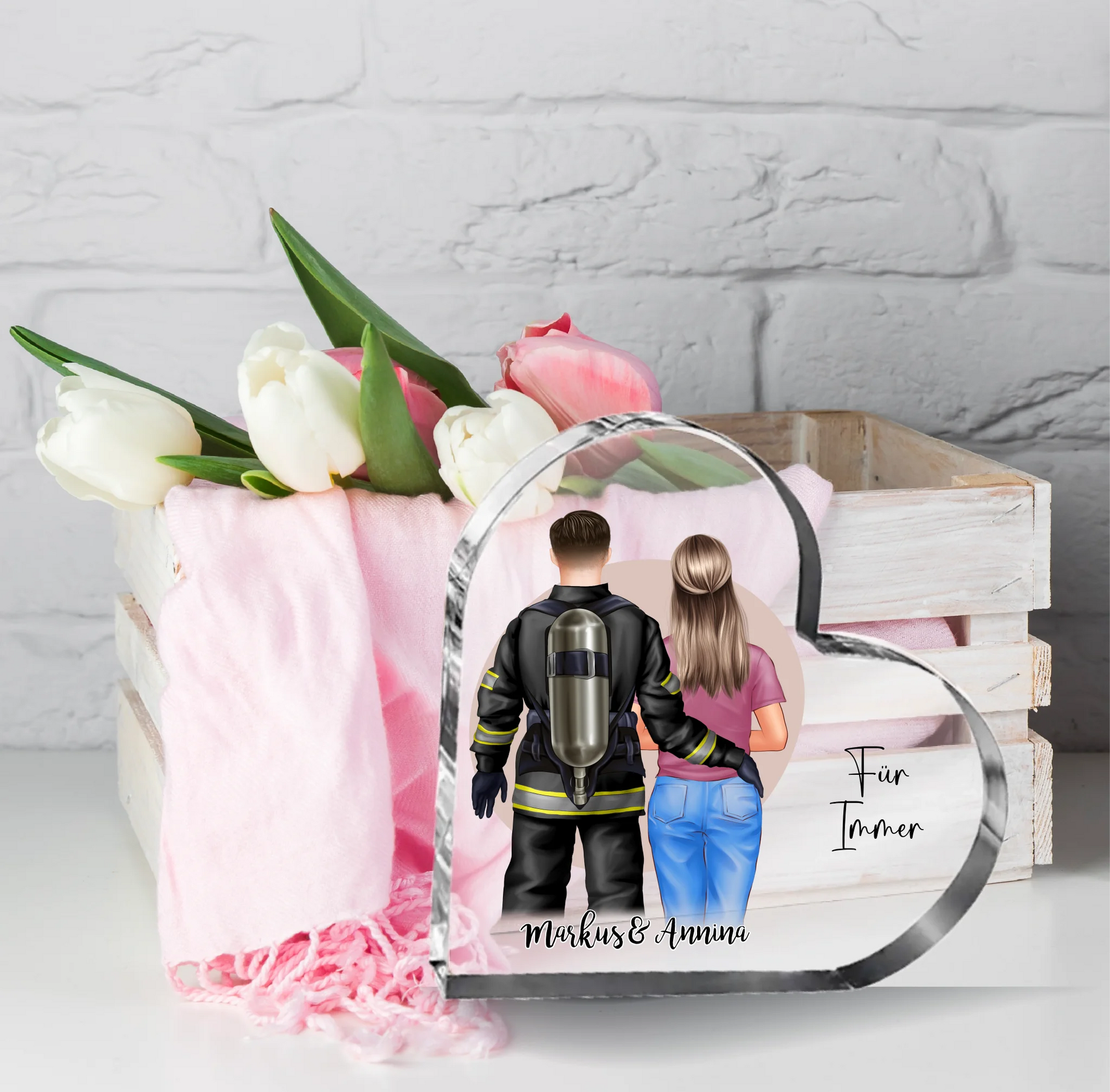 Feuerwehrmann & Frau Glasauftsteller Herz