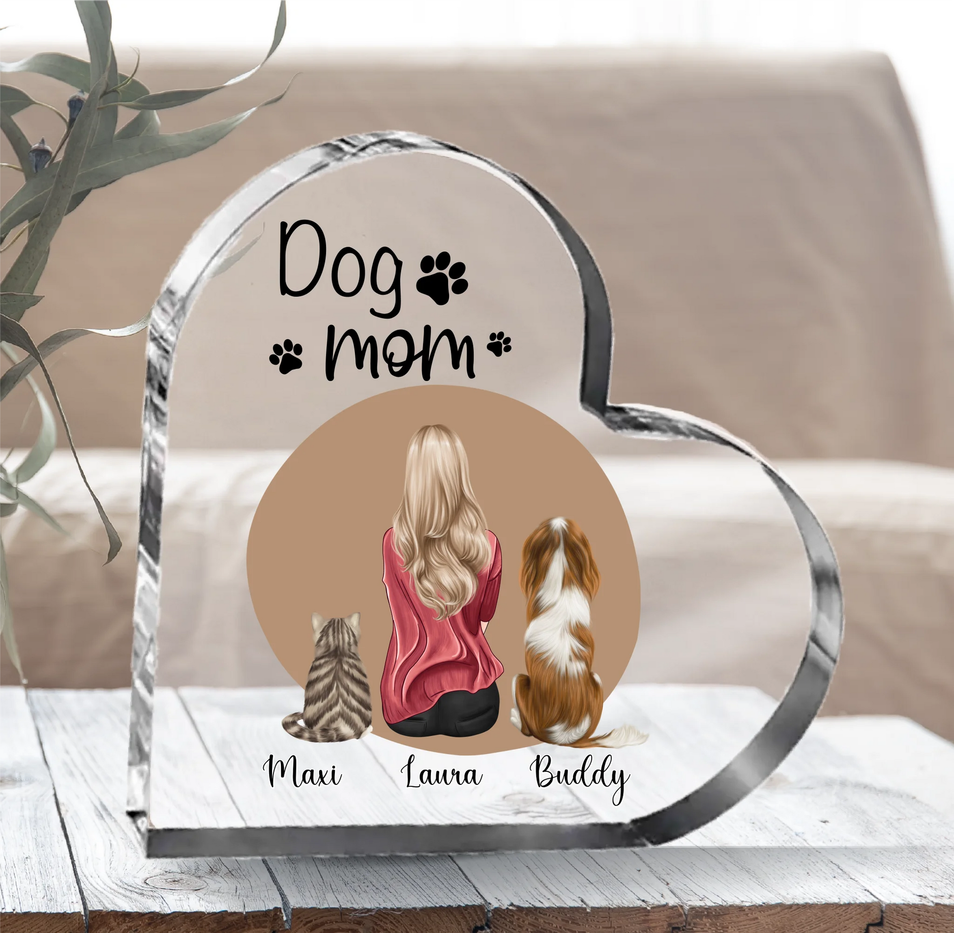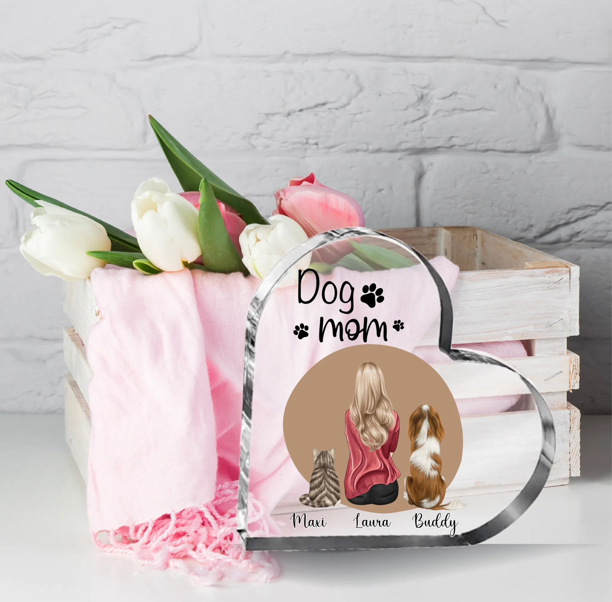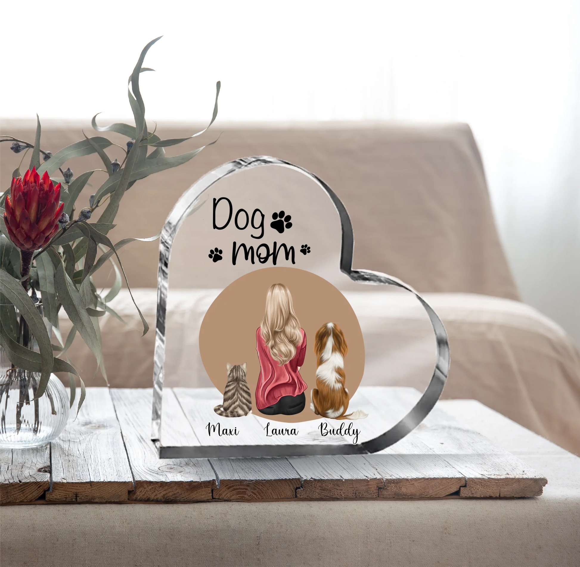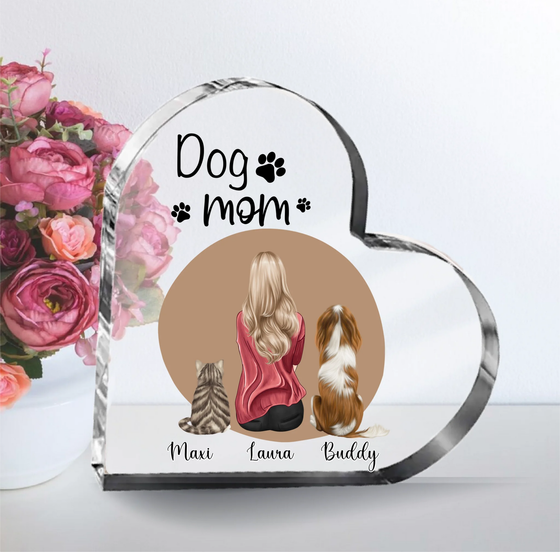 Frau/Mann mit 2 Haustieren Herz Glasaufsteller