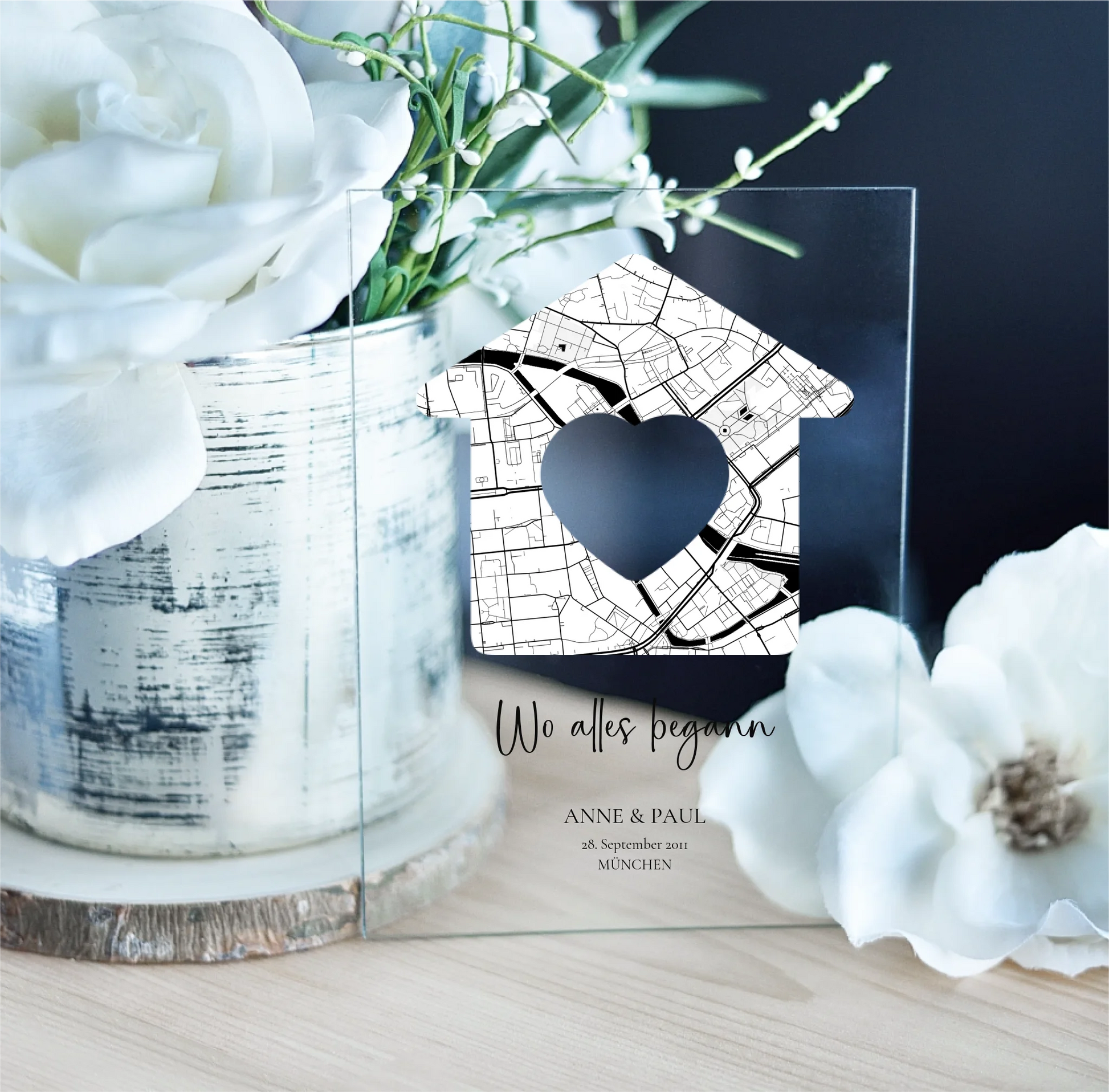 Stadtkarte - Haus - Acrylschild mit Holzstandfuß
