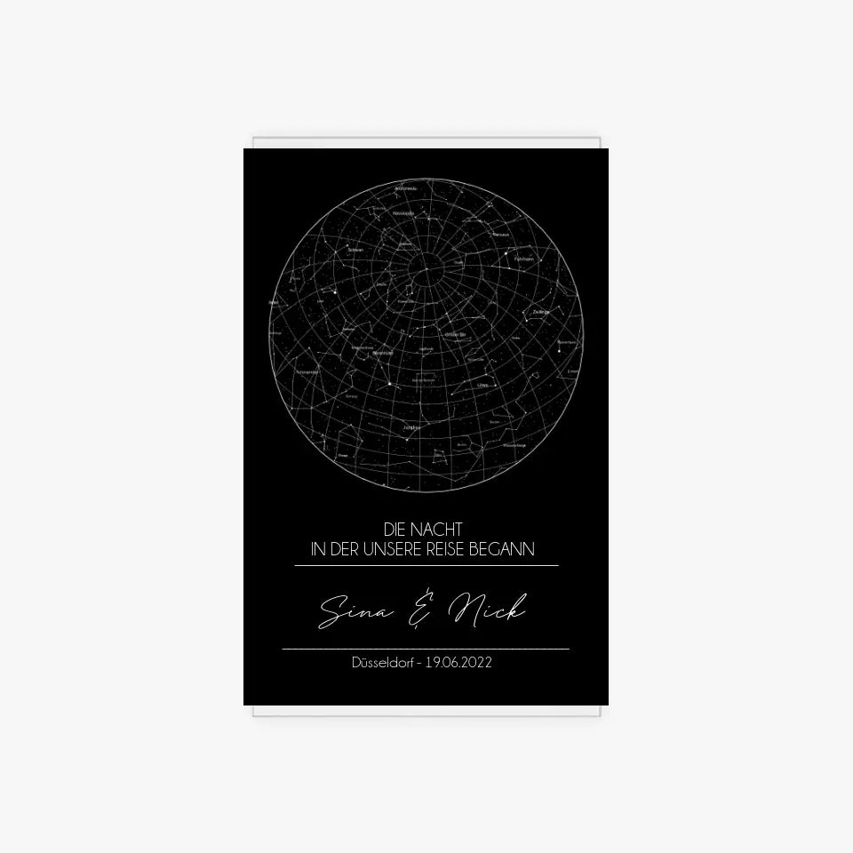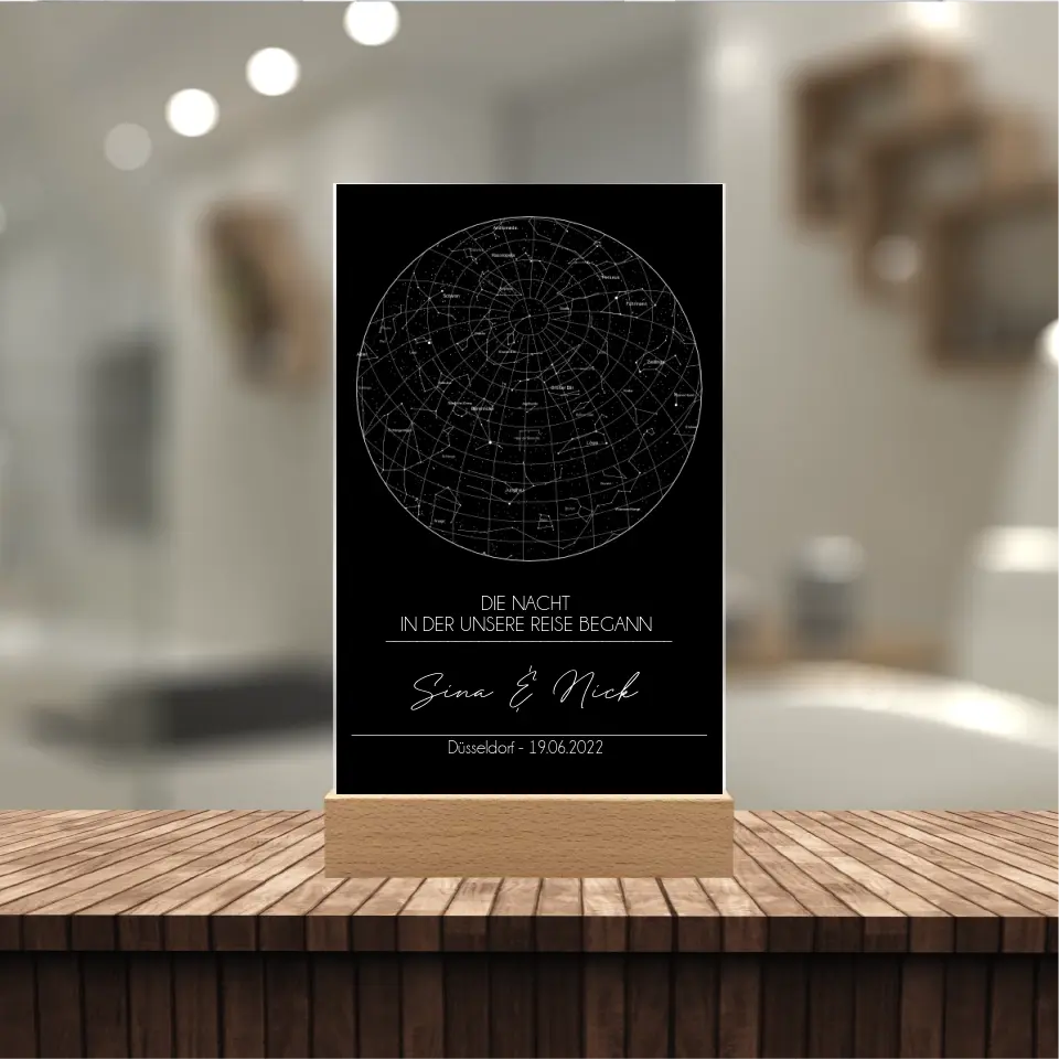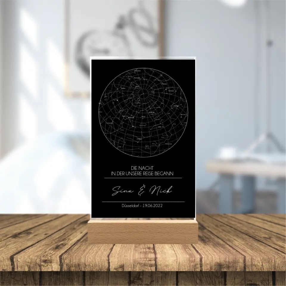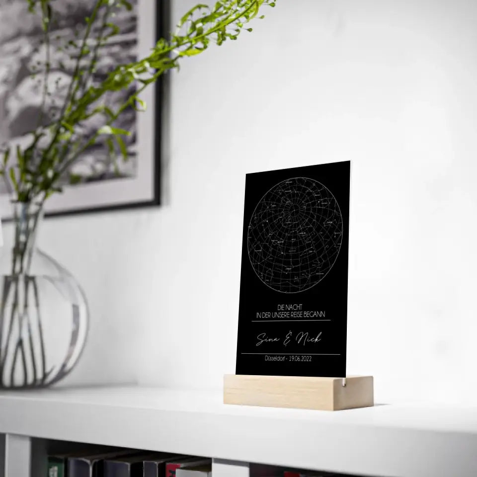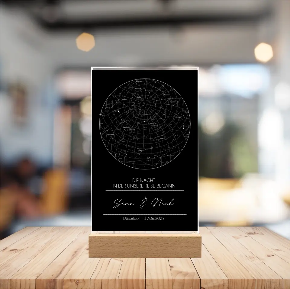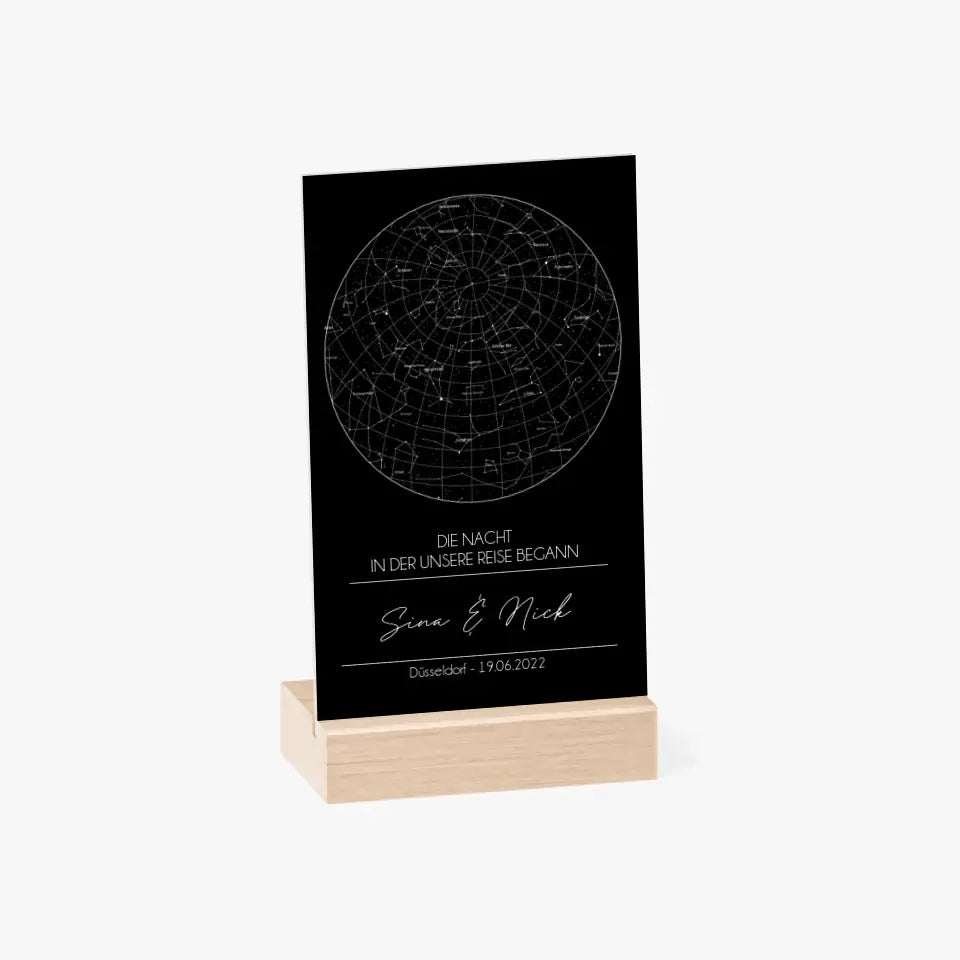Sternenkarte Acrylschild mit Holzstandfuß - Die Nacht in der unsere Reise begann