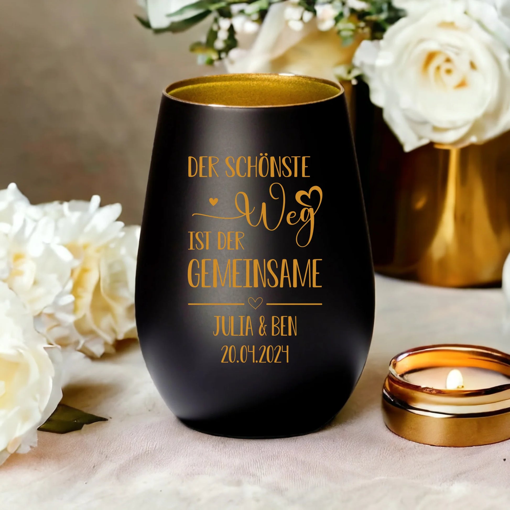 Durch die Beleuchtung wird die Innenfarbe des Windlichtes hervorgehoben. So scheint die Schrift dann golden.