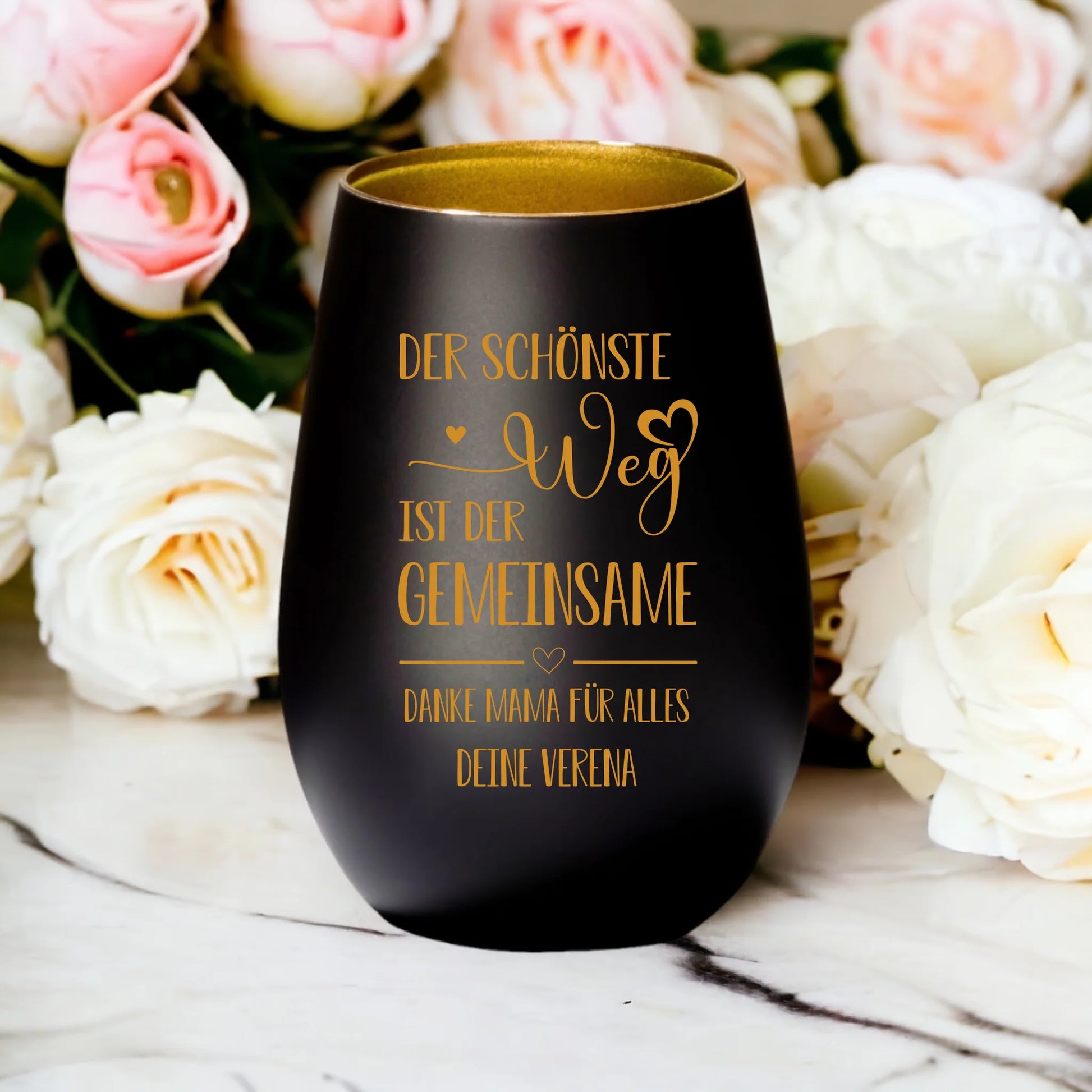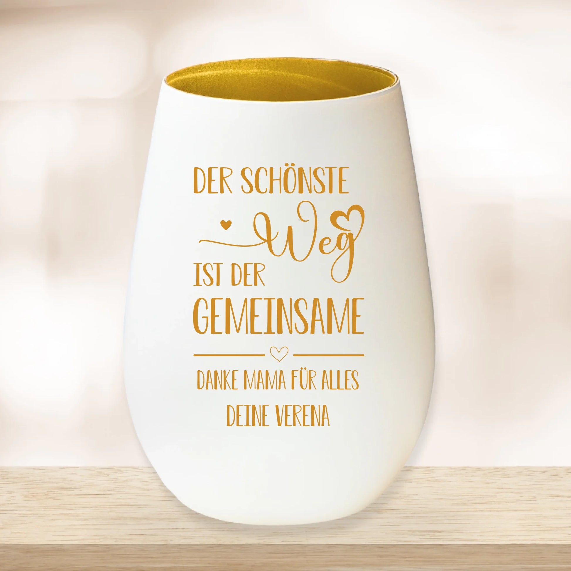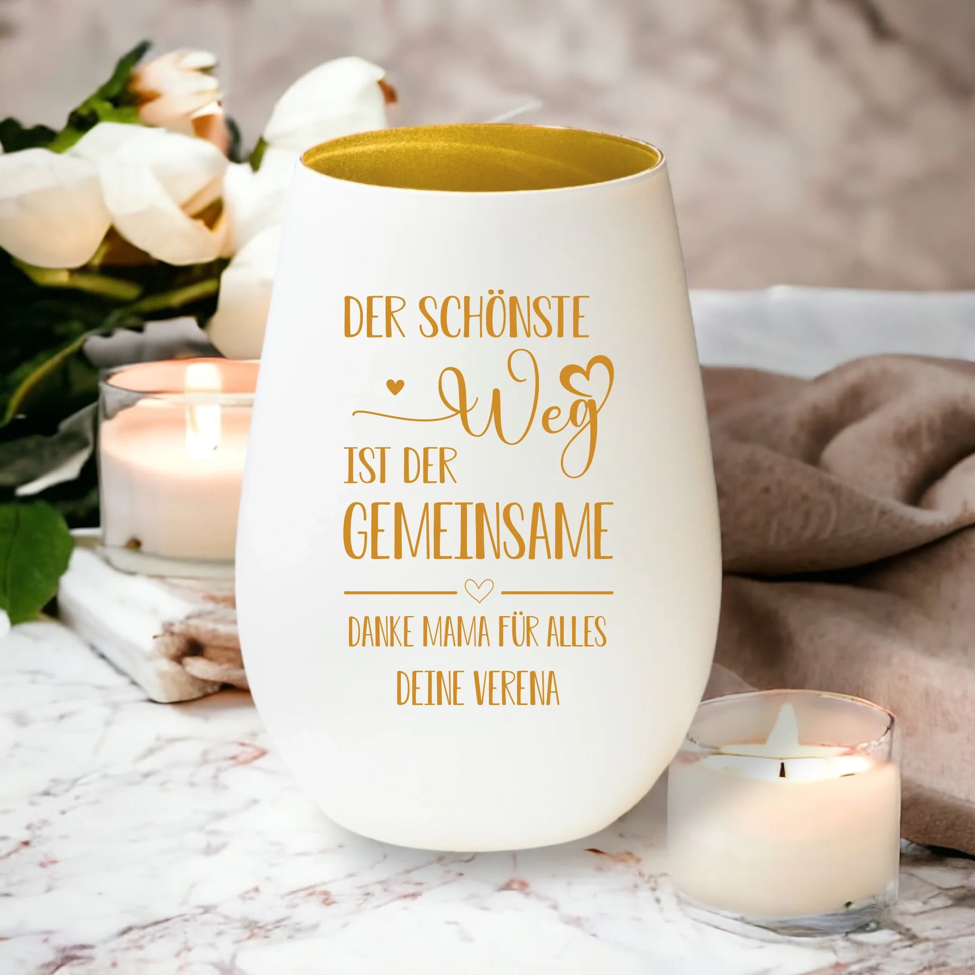 Durch die Beleuchtung wird die Innenfarbe des Windlichtes hervorgehoben. So scheint die Schrift dann golden.