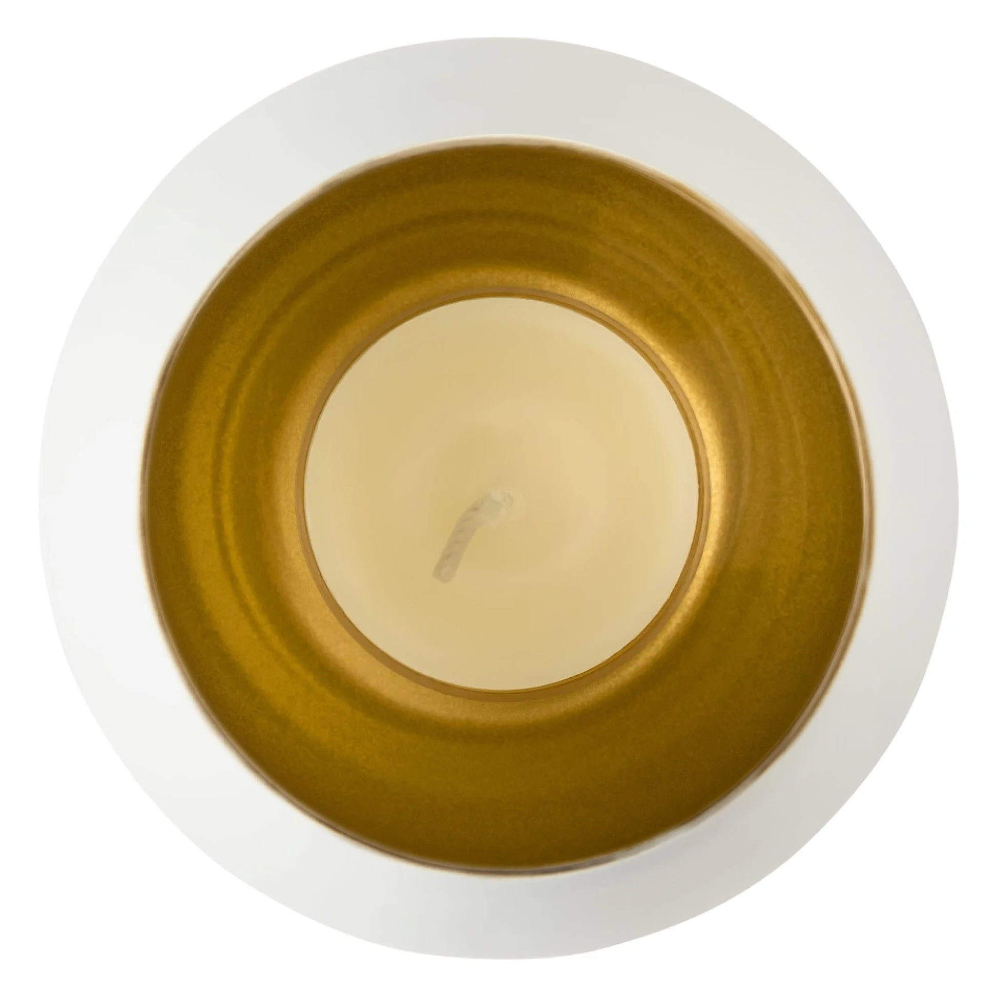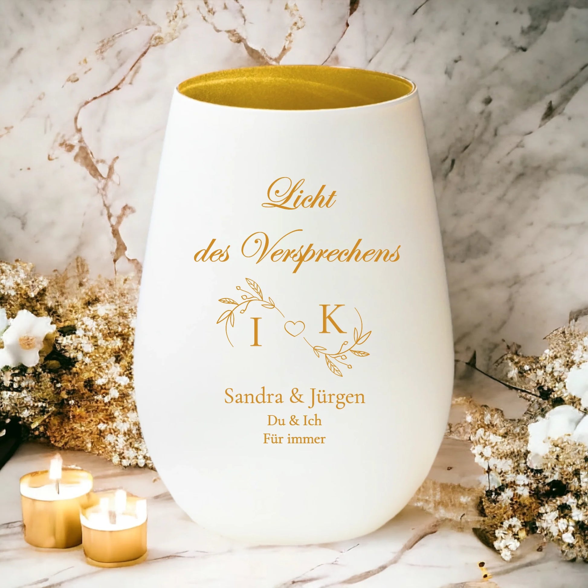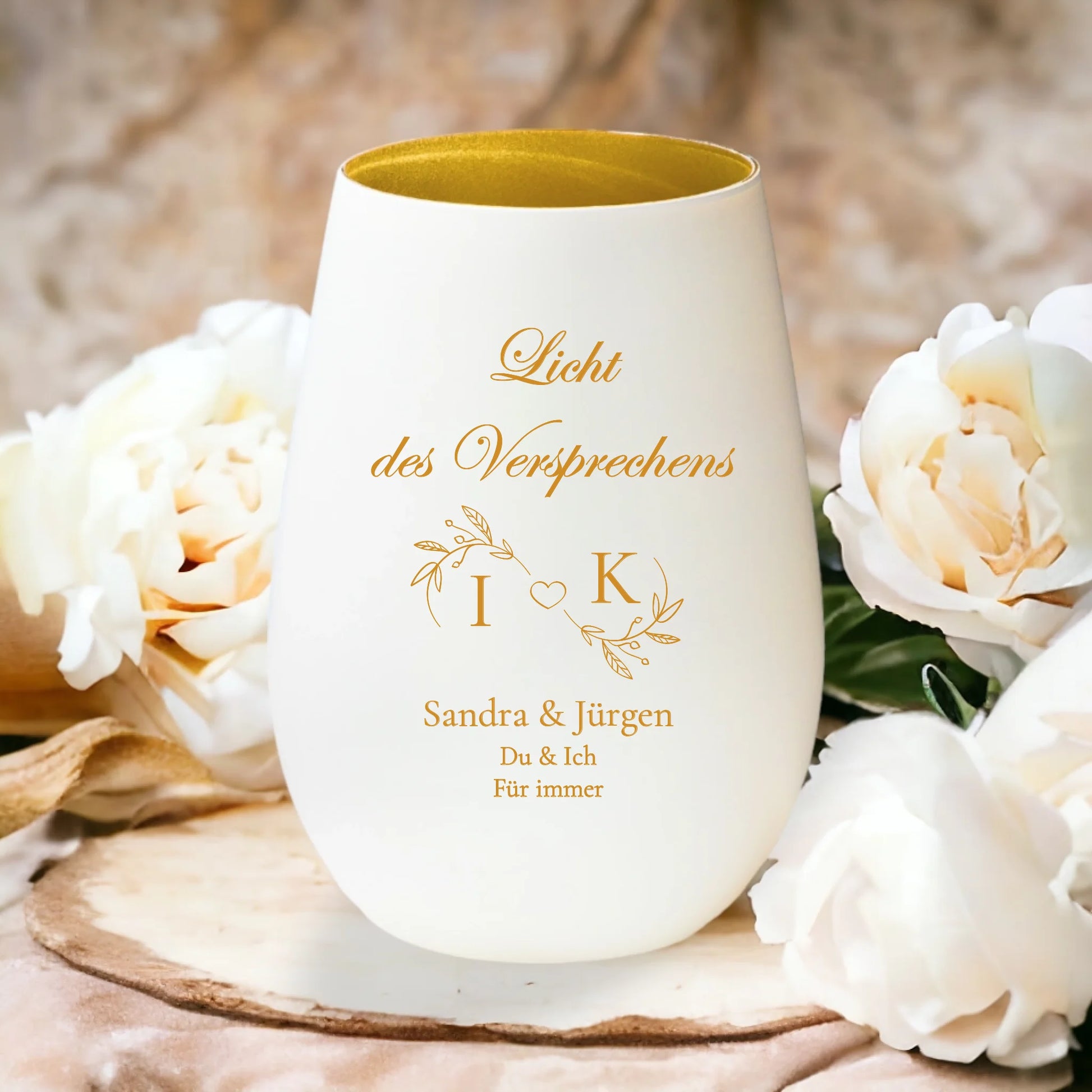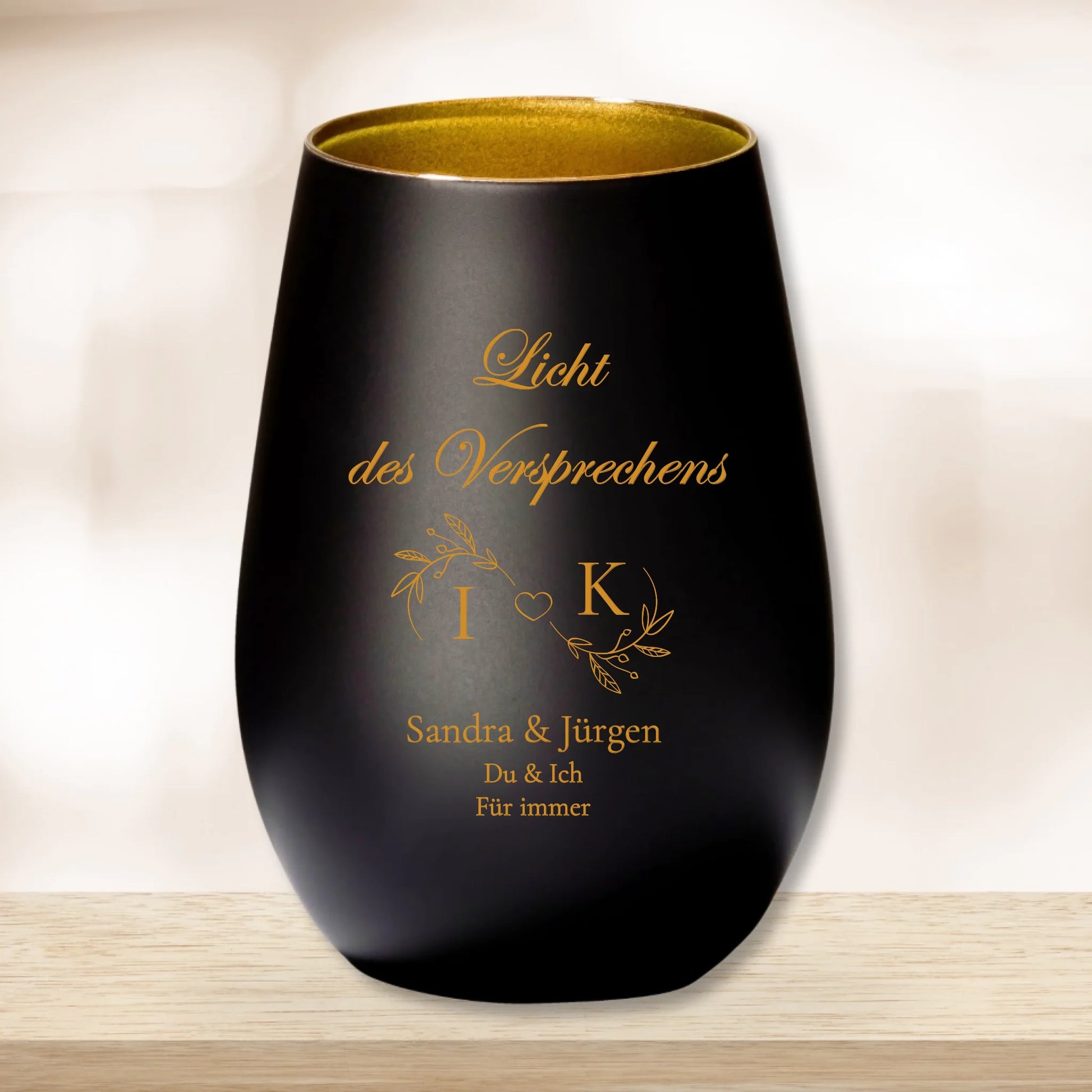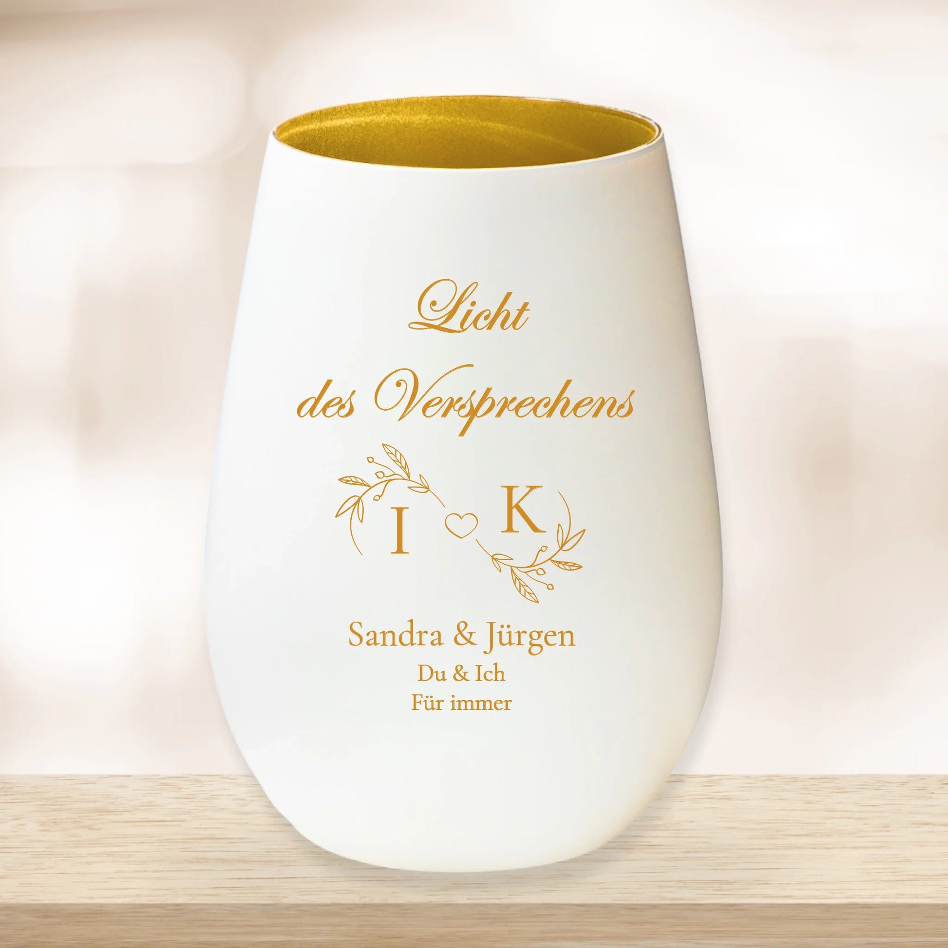 Durch die Beleuchtung wird die Innenfarbe des Windlichtes hervorgehoben. So scheint die Schrift dann golden.