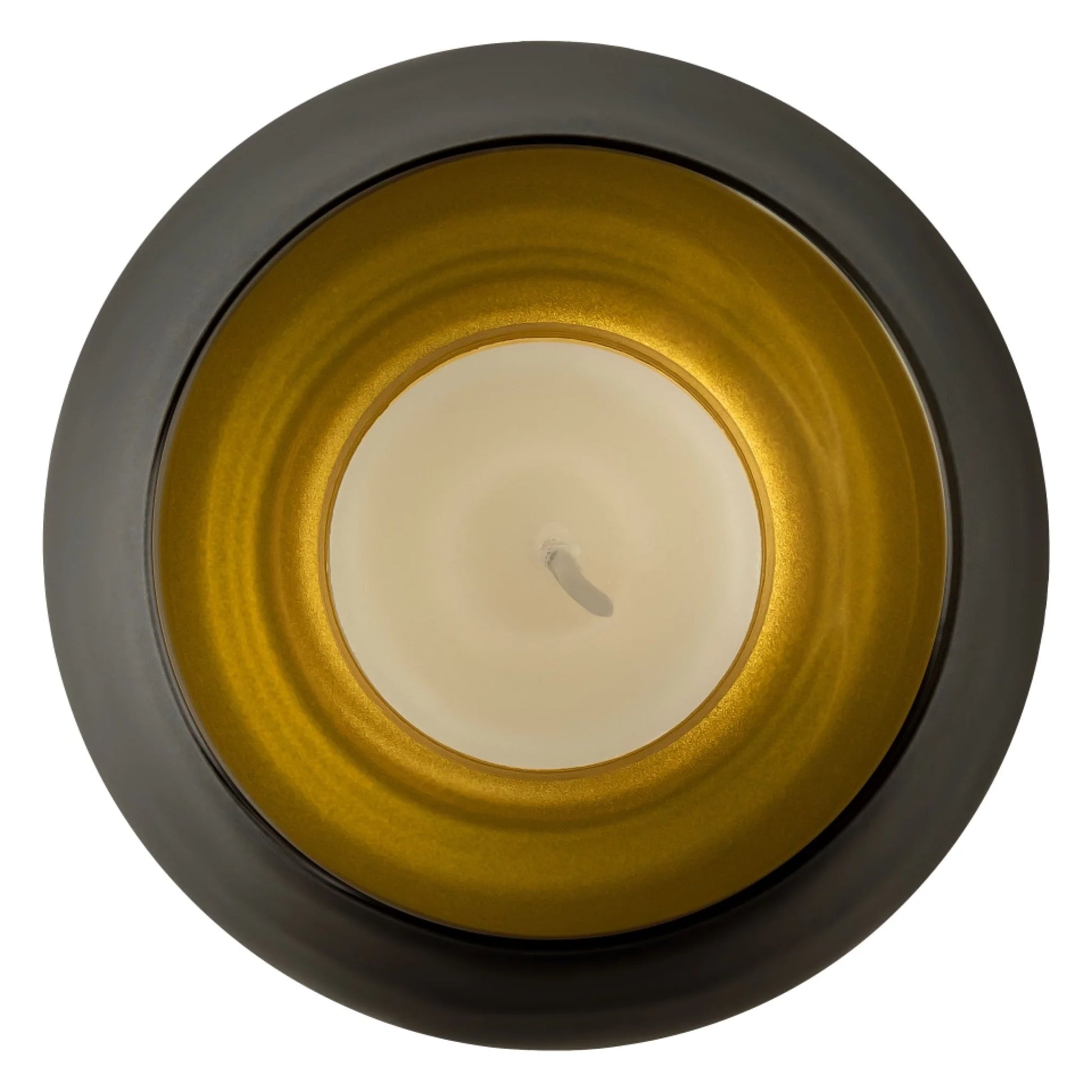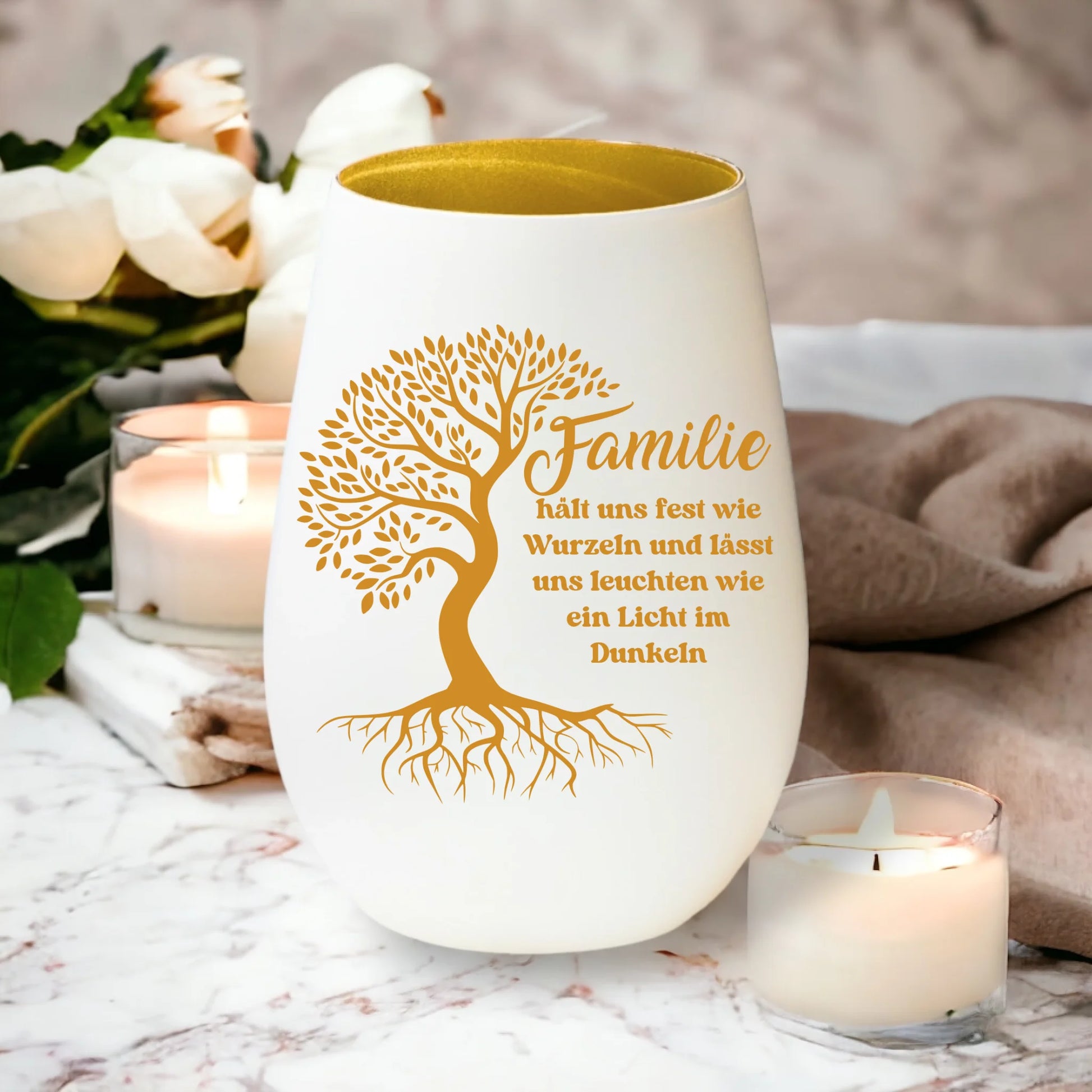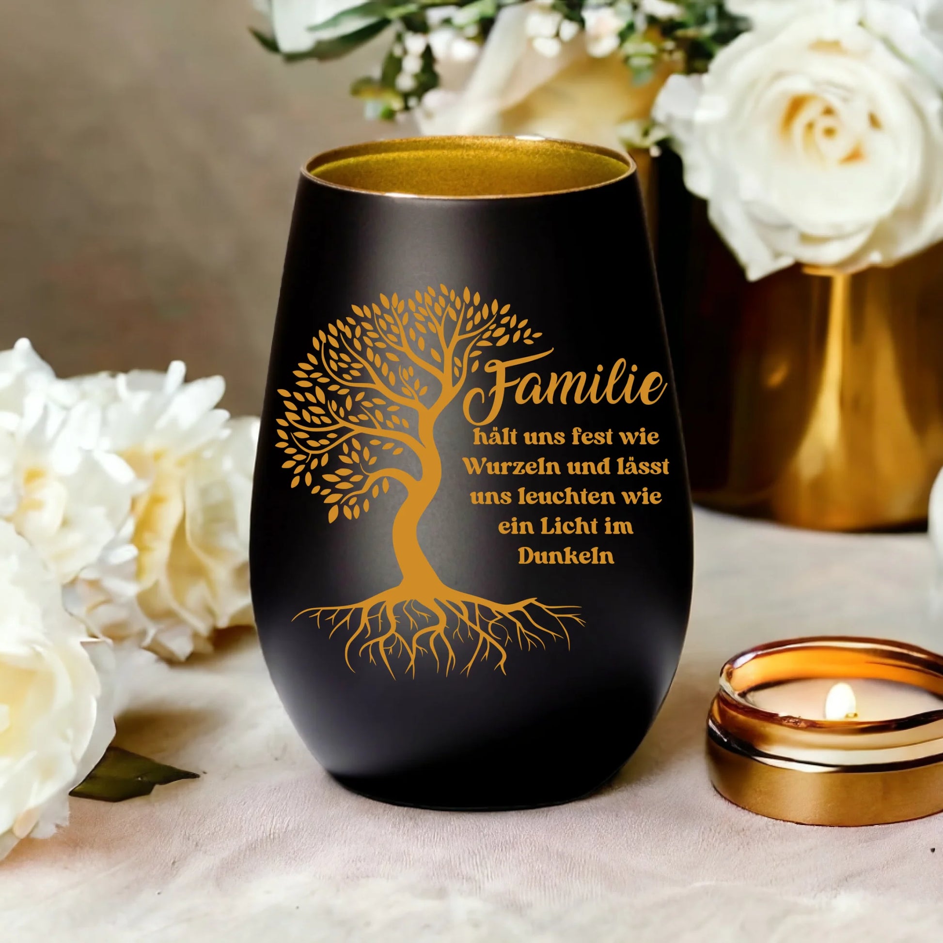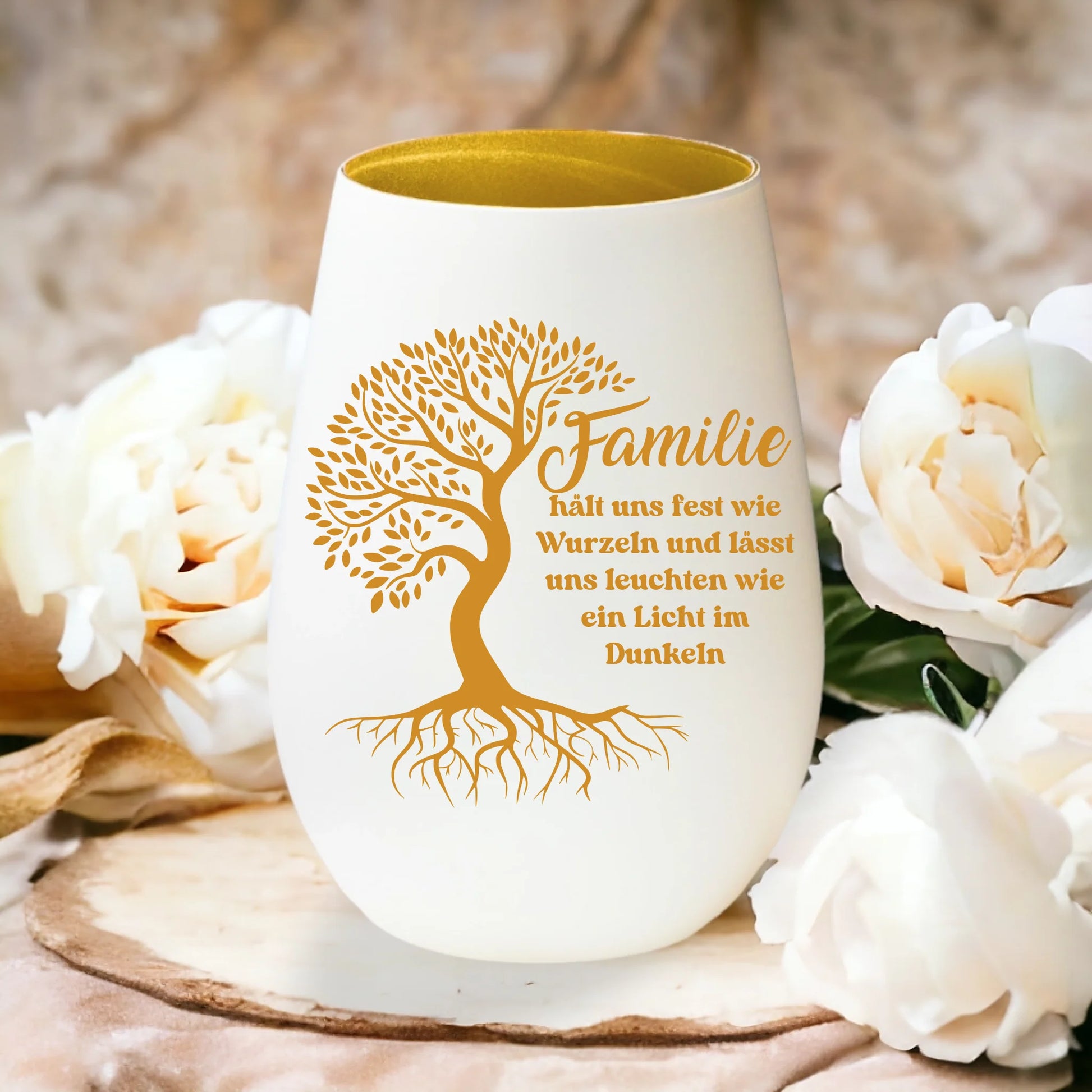 Durch die Beleuchtung wird die Innenfarbe des Windlichtes hervorgehoben. So scheint die Schrift dann golden.