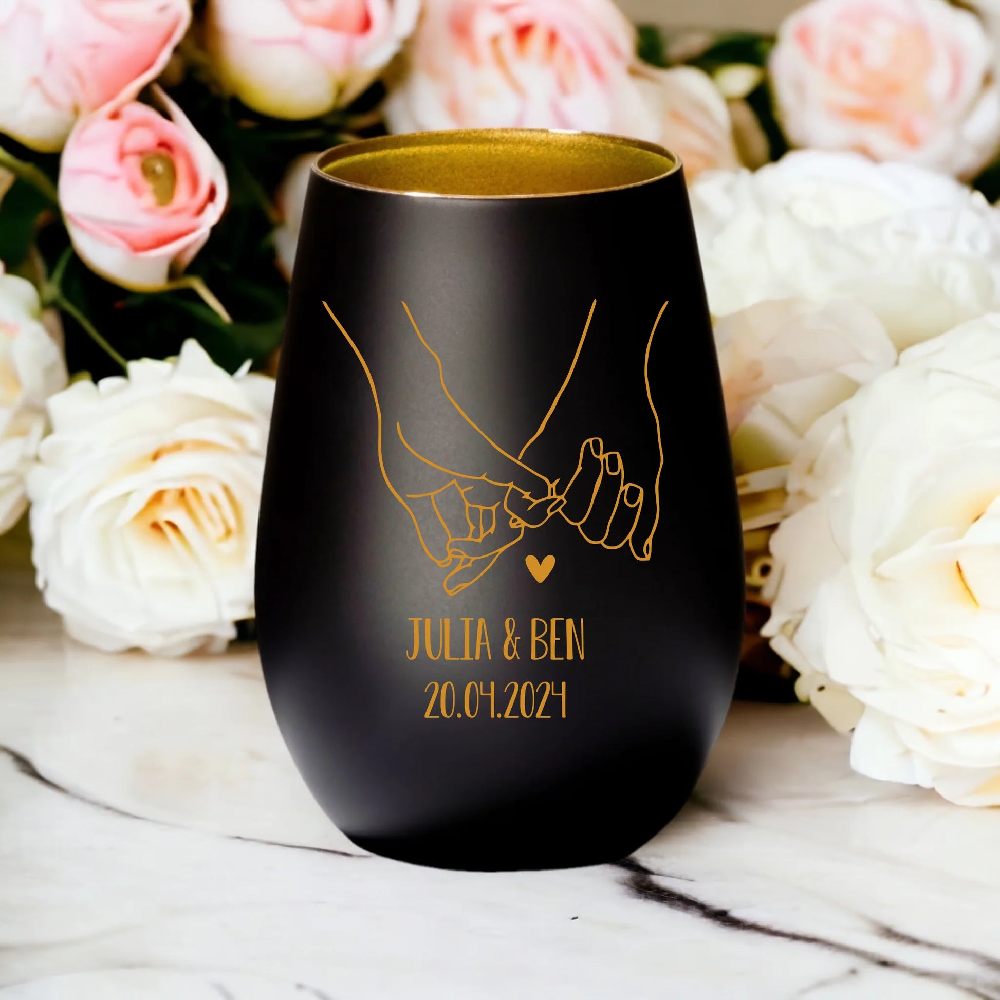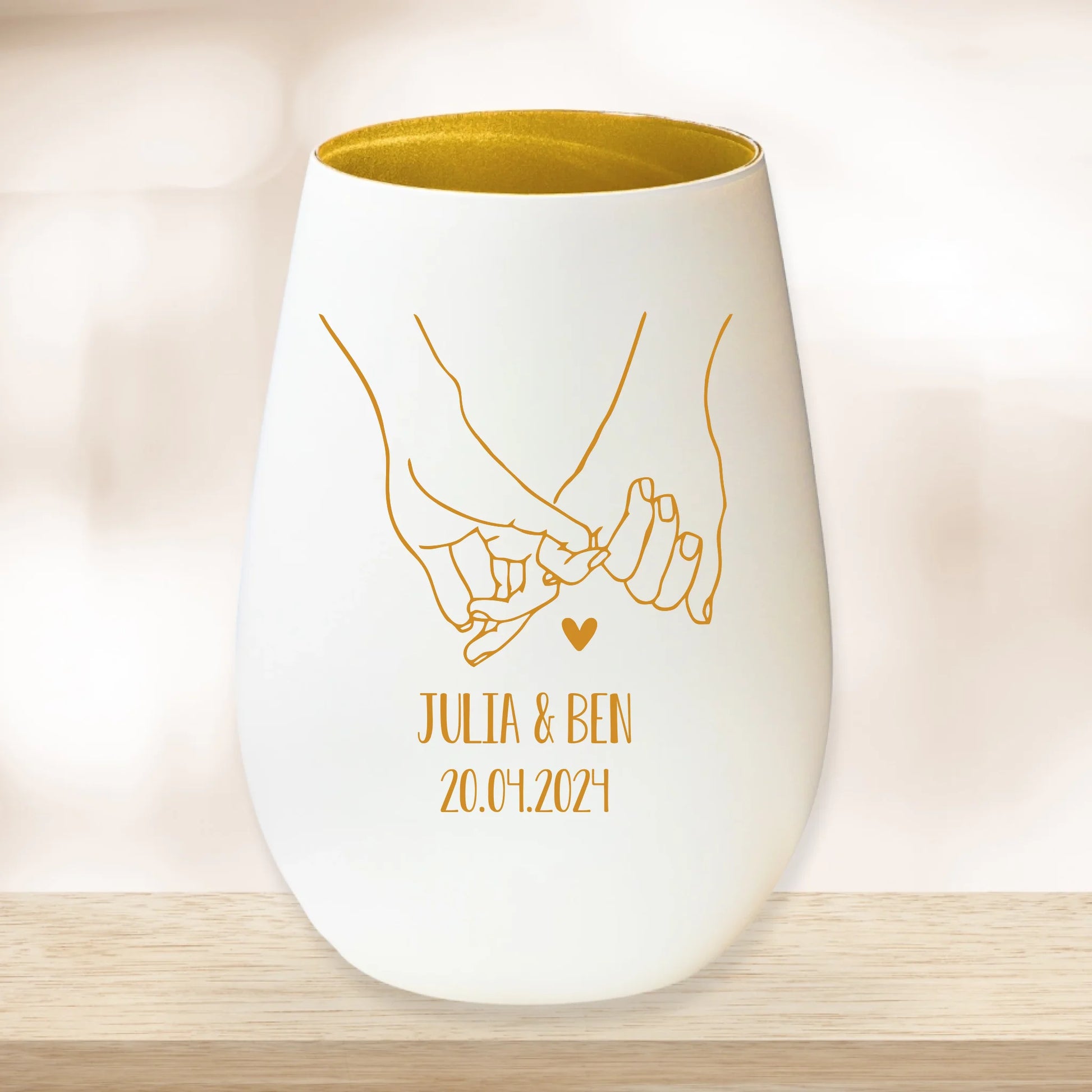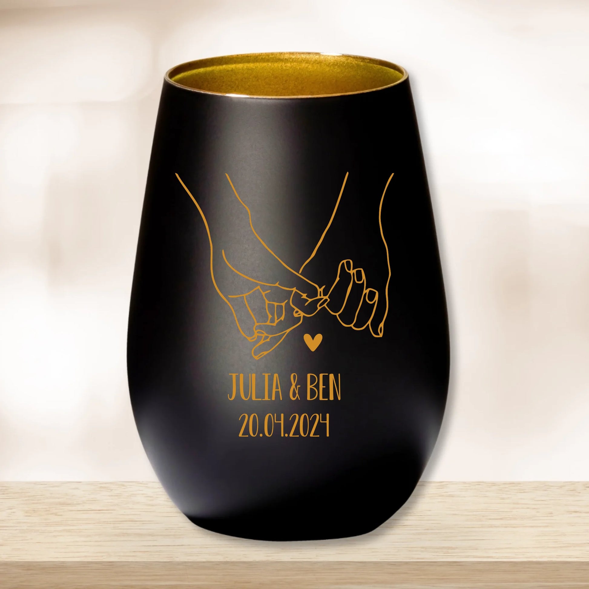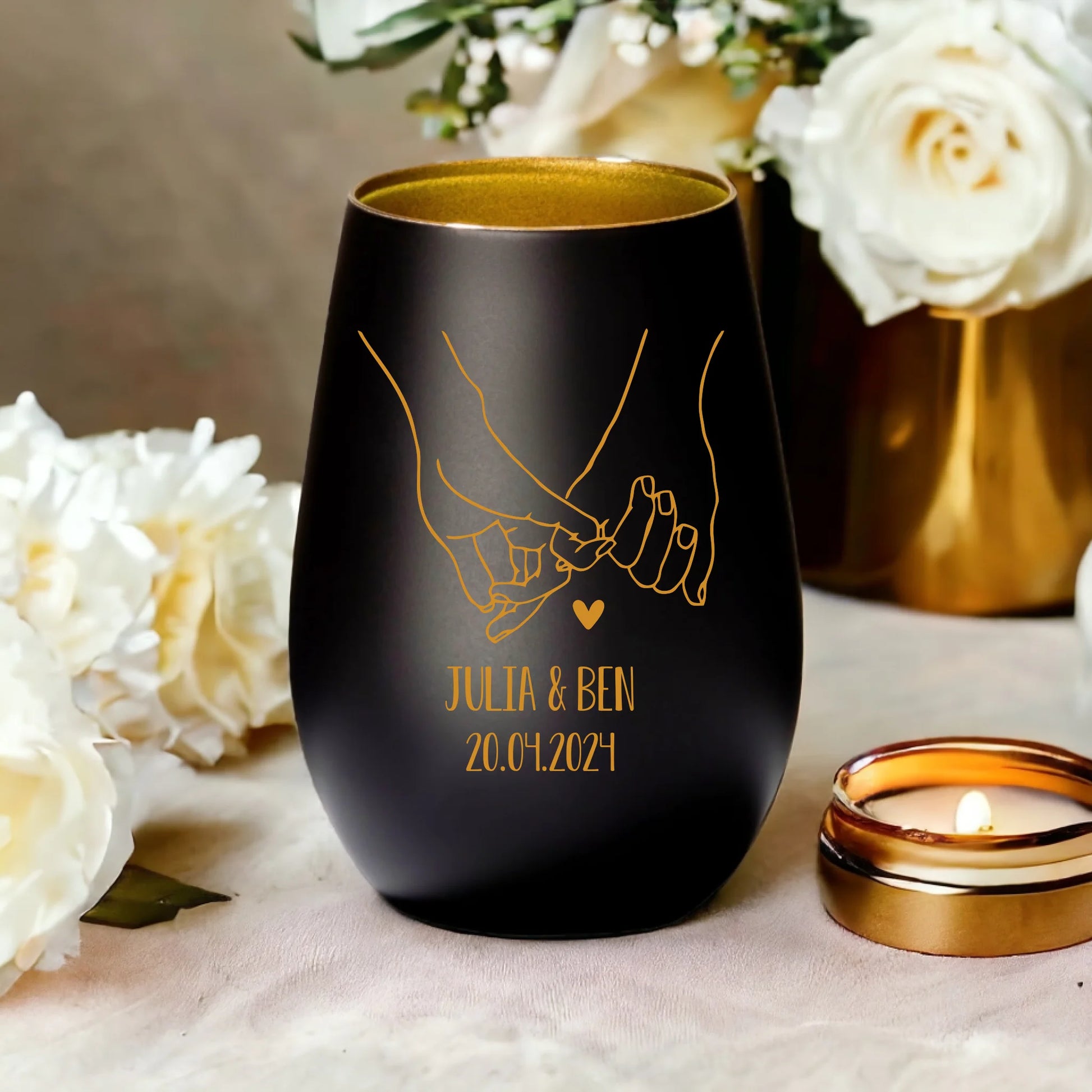 Durch die Beleuchtung wird die Innenfarbe des Windlichtes hervorgehoben. So scheint die Schrift dann golden.