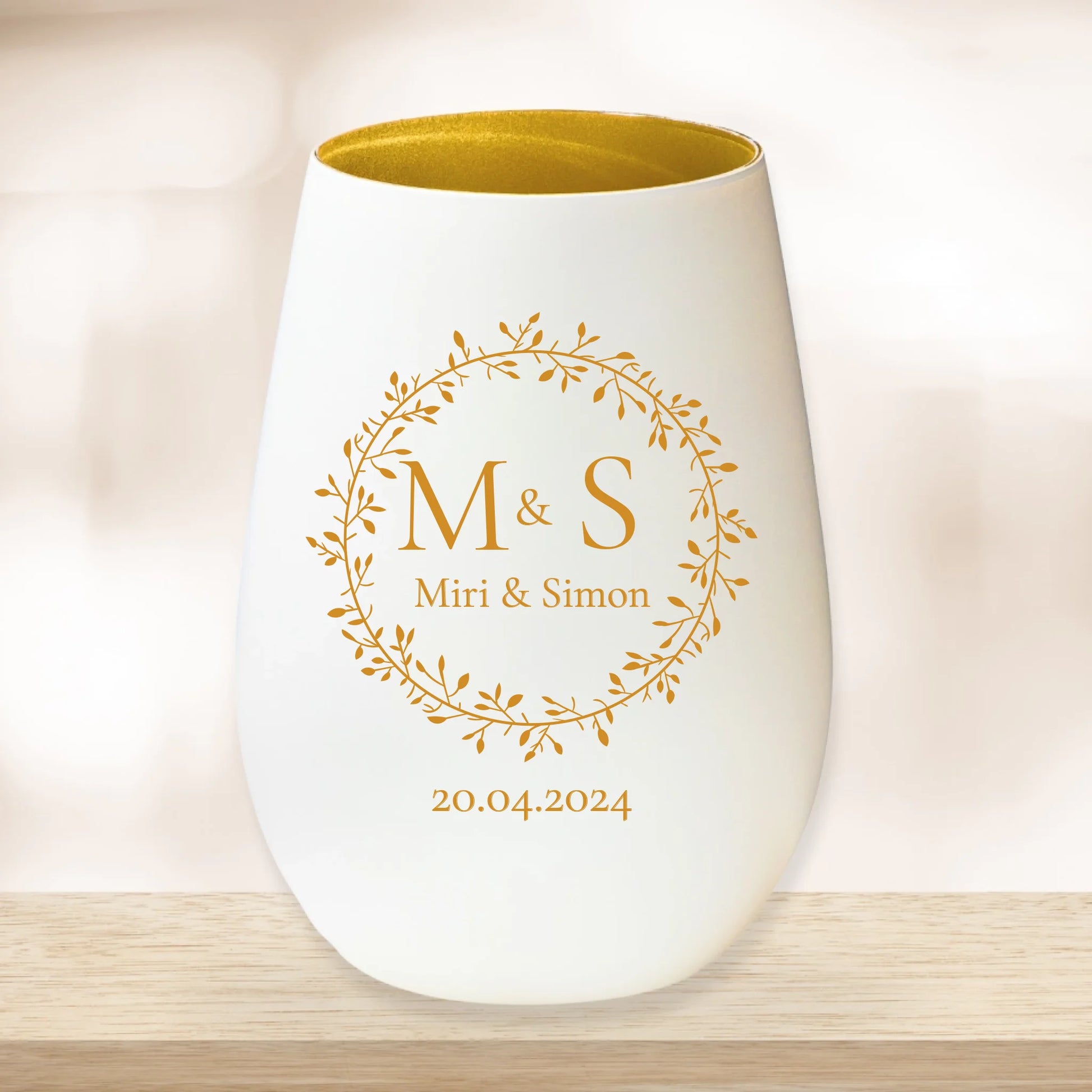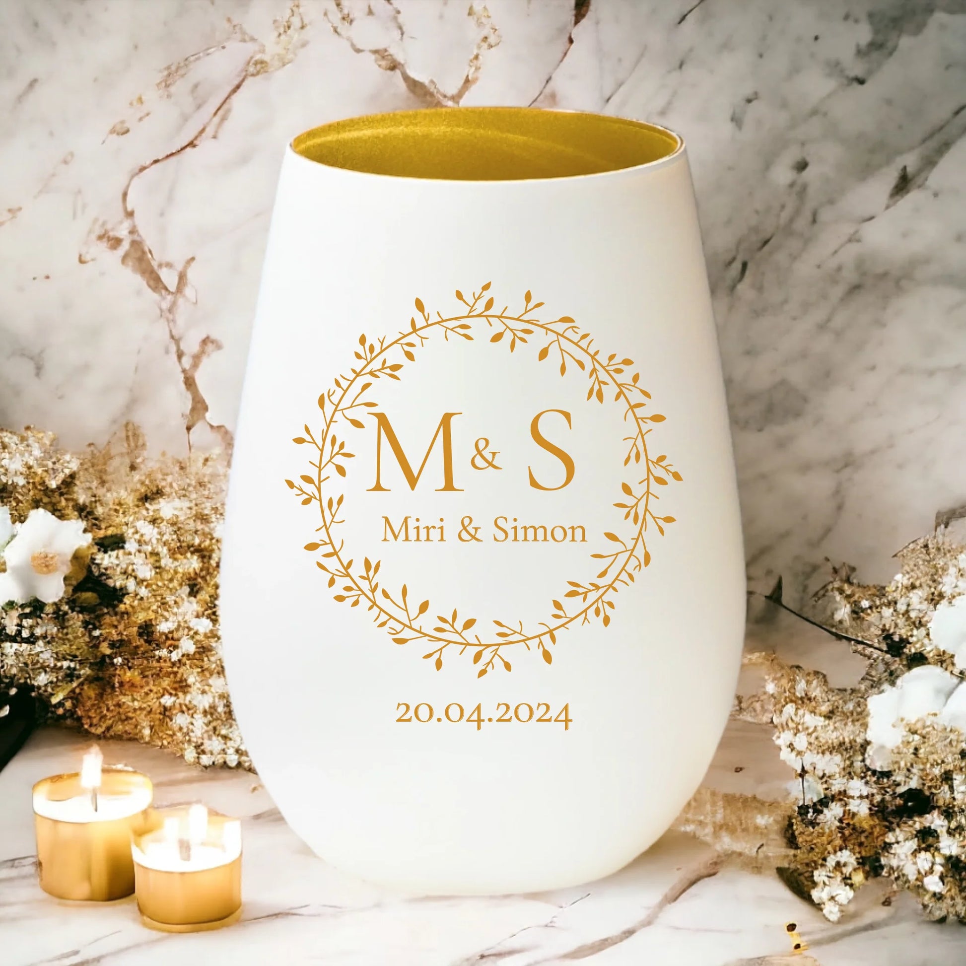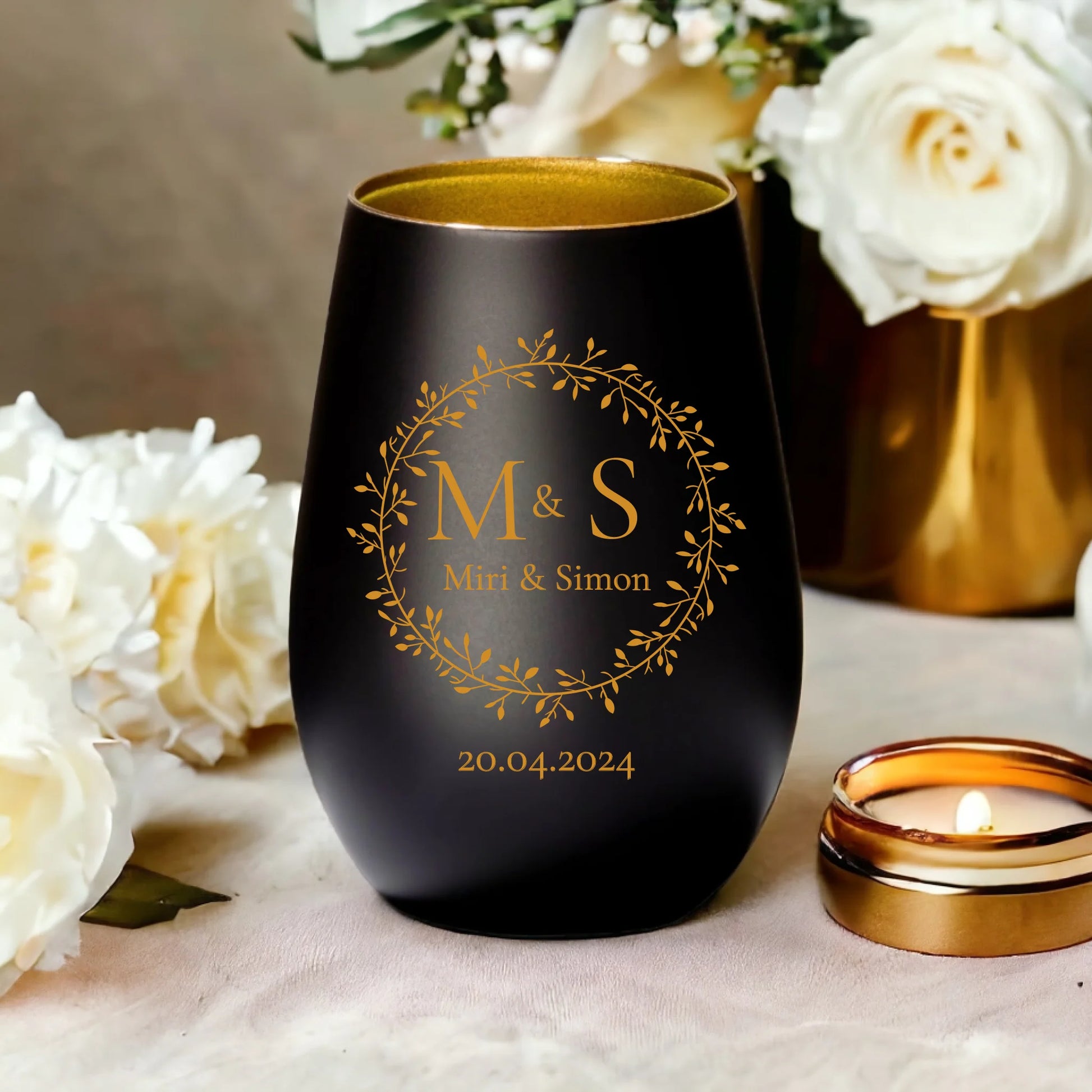 Durch die Beleuchtung wird die Innenfarbe des Windlichtes hervorgehoben. So scheint die Schrift dann golden.