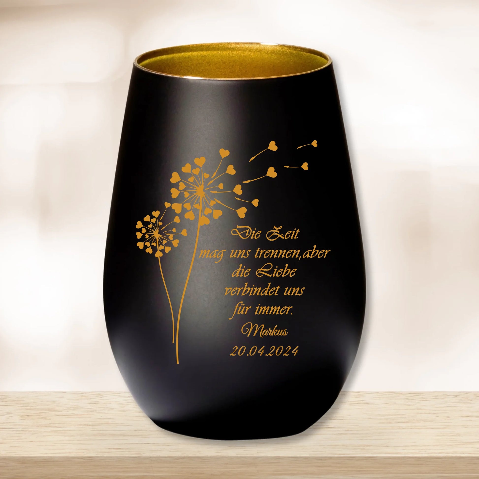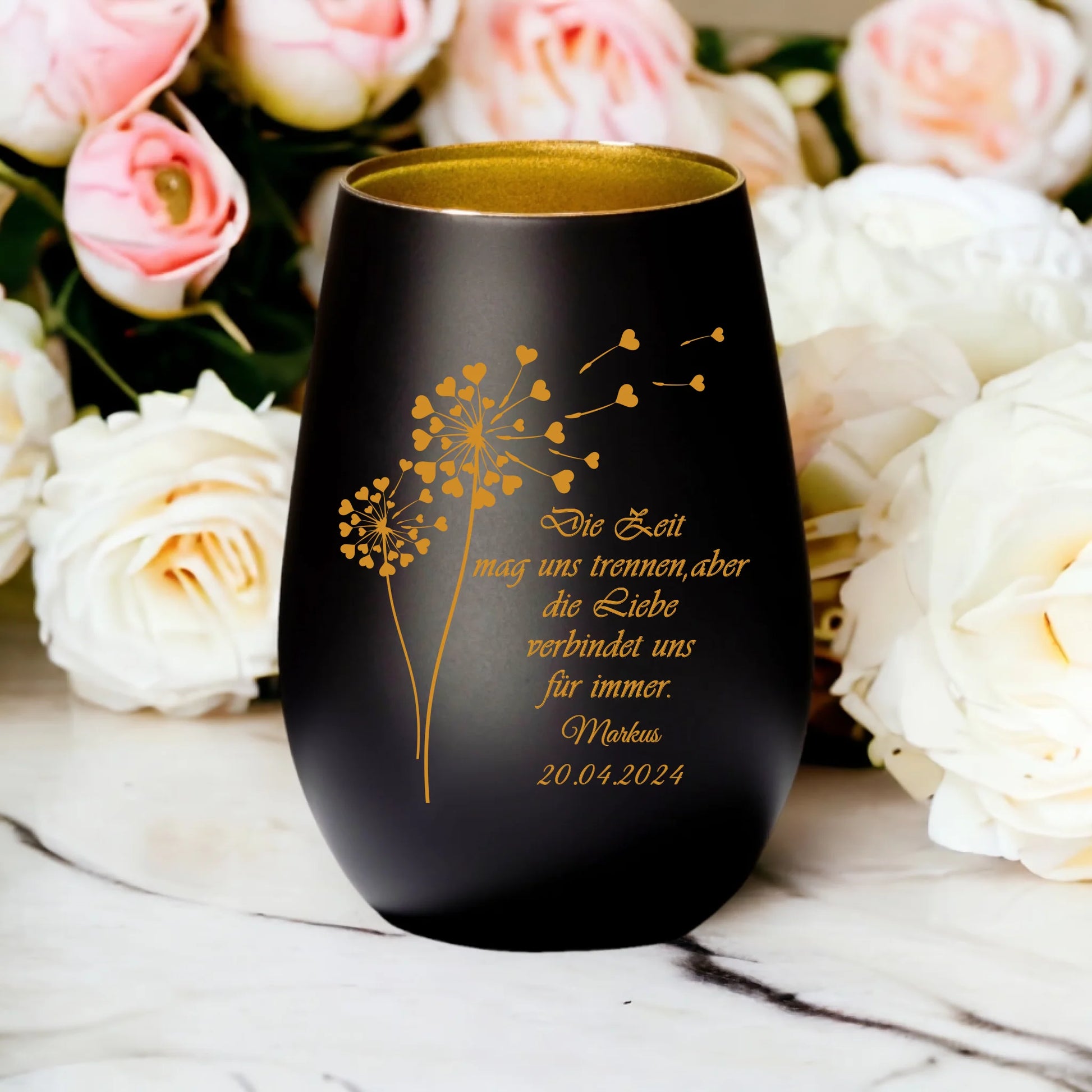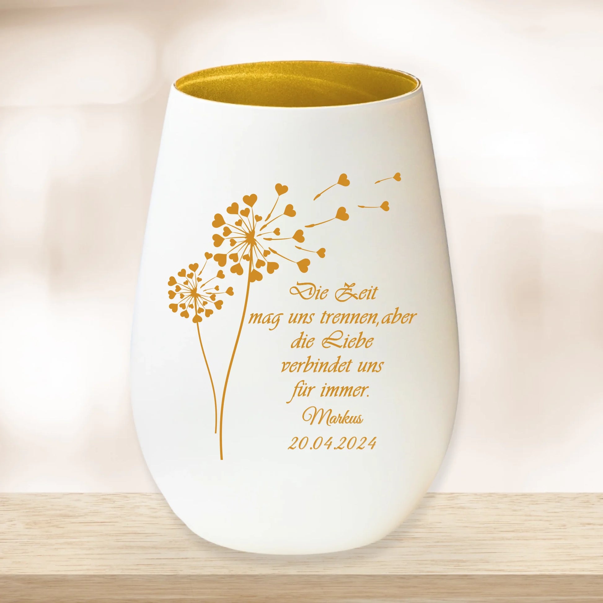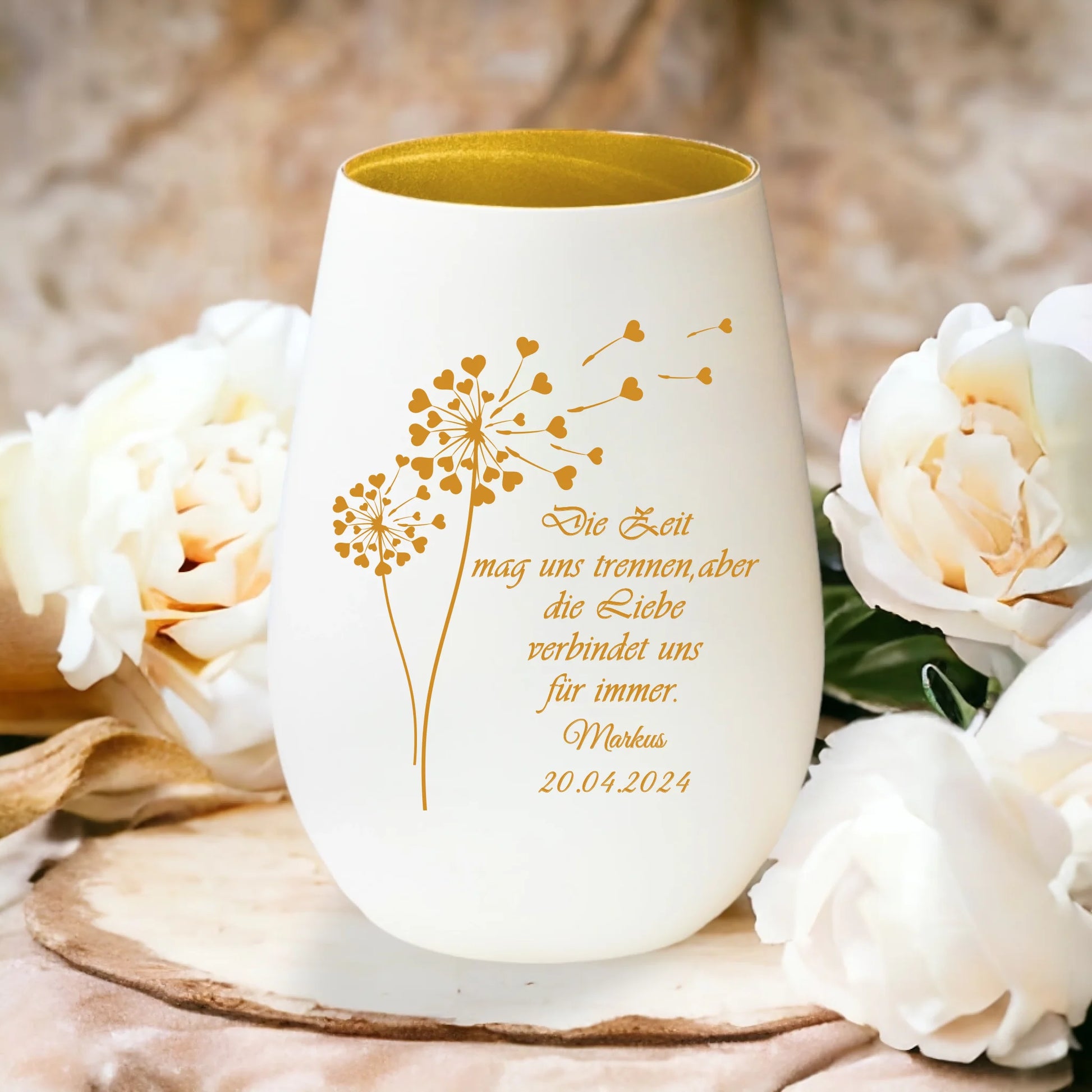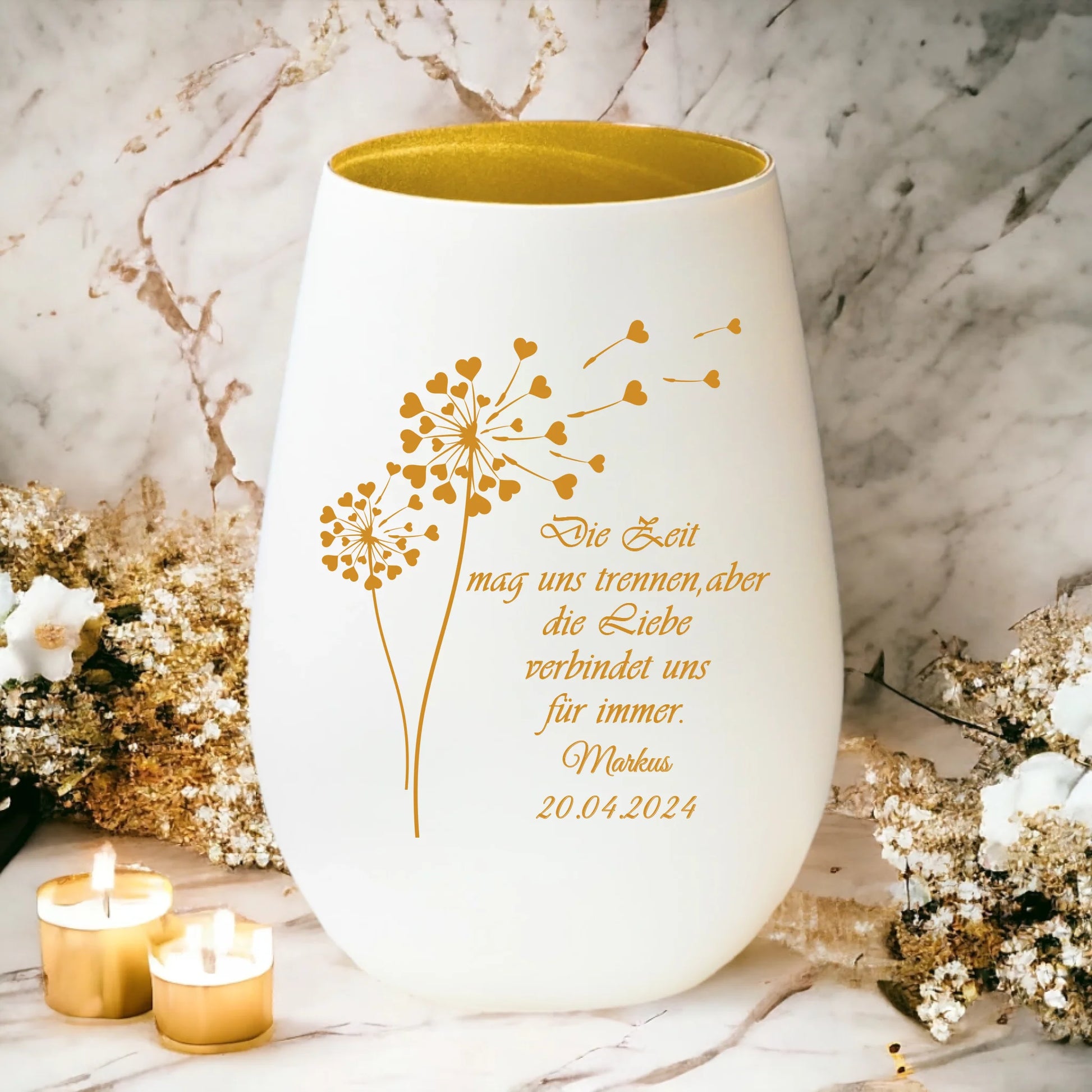 Durch die Beleuchtung wird die Innenfarbe des Windlichtes hervorgehoben. So scheint die Schrift dann golden.