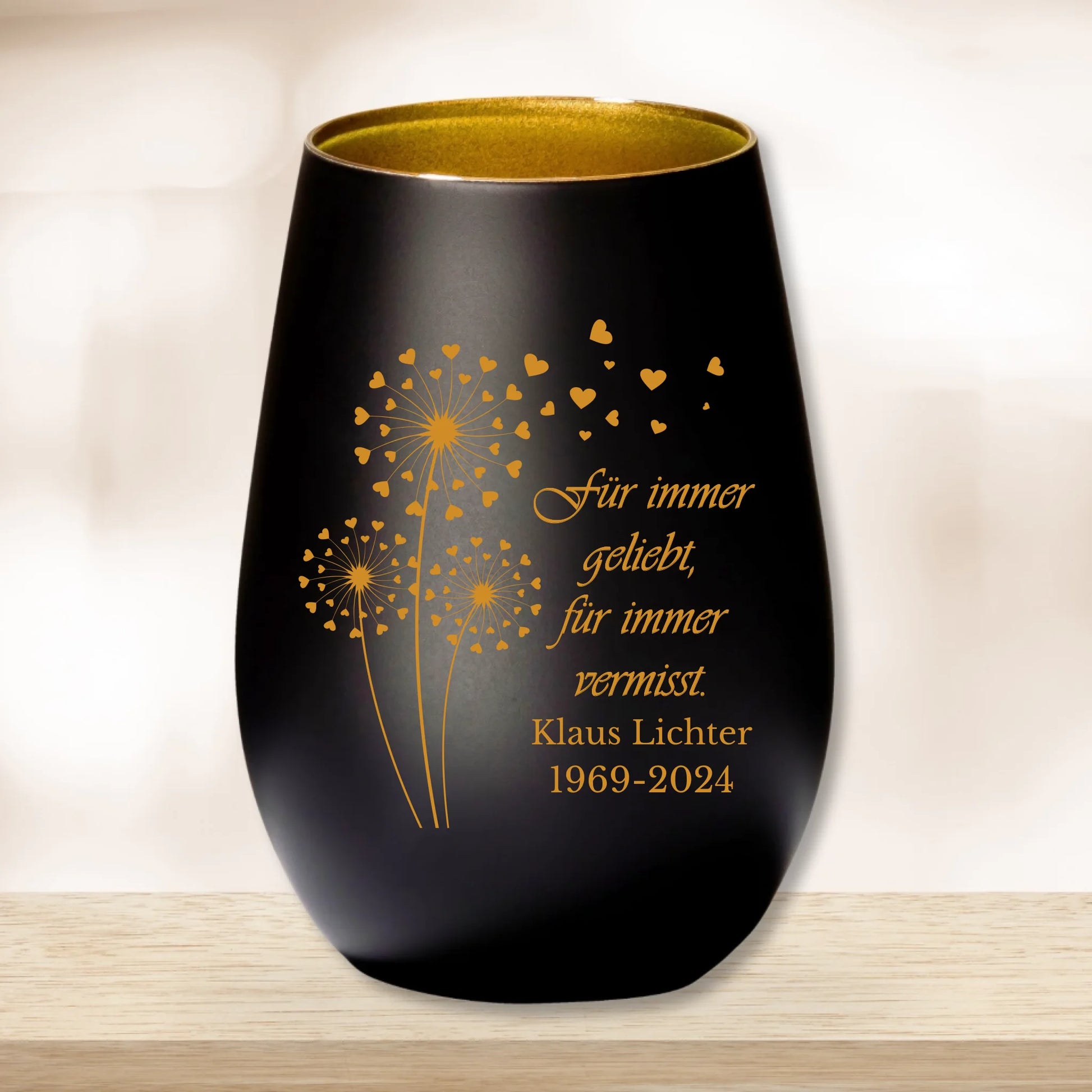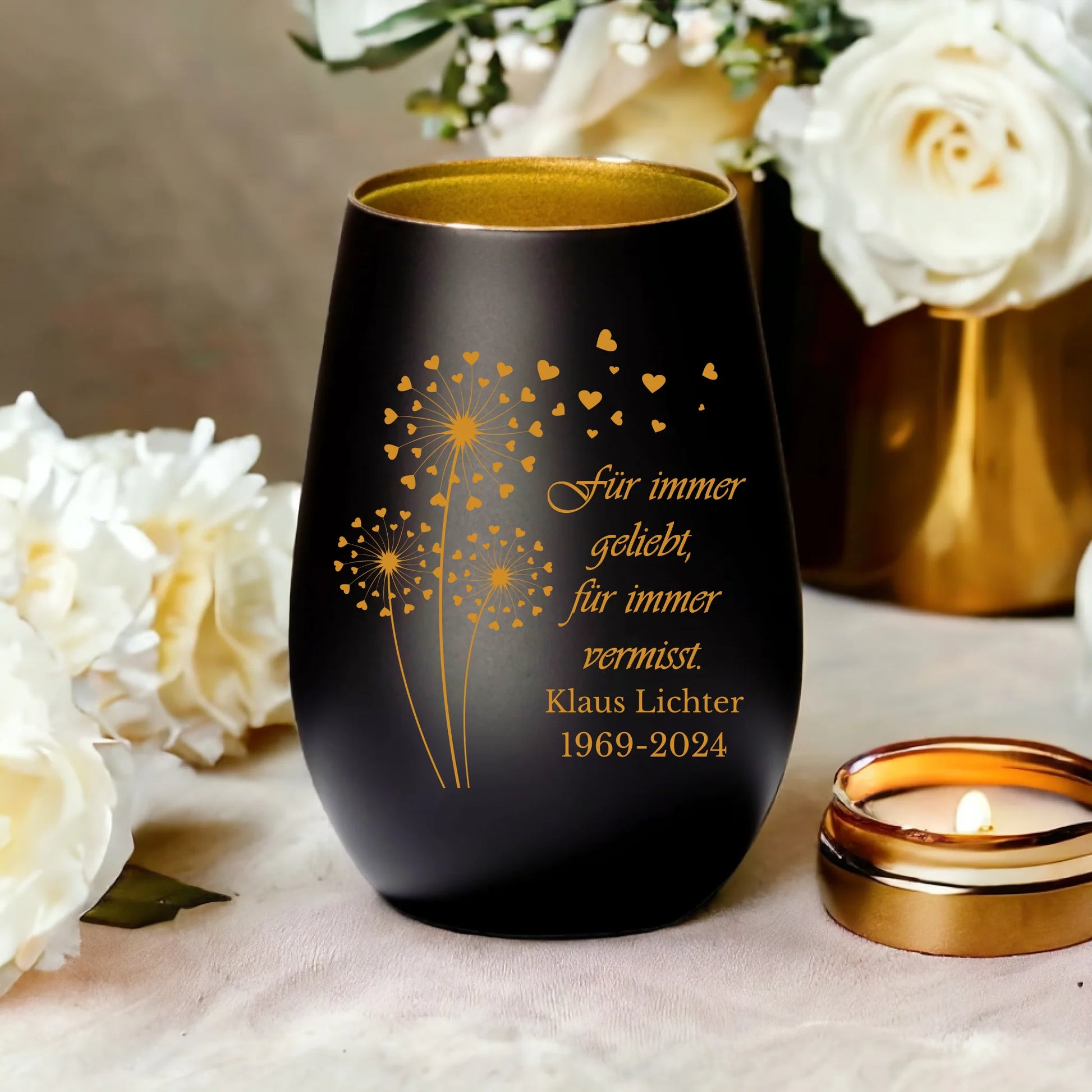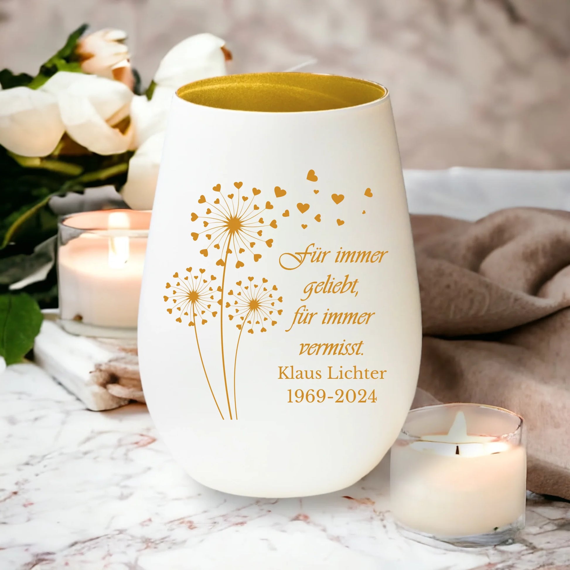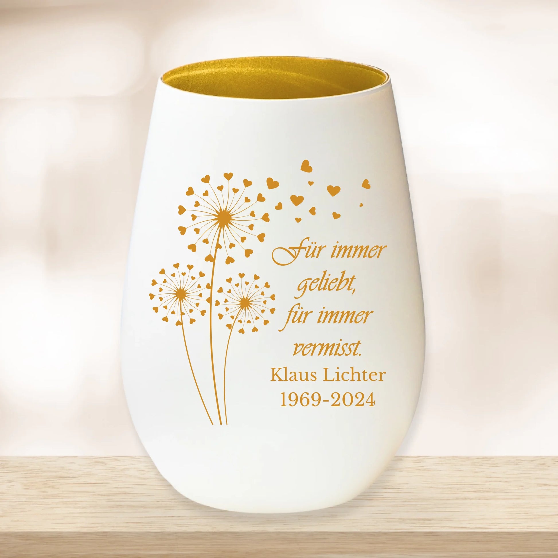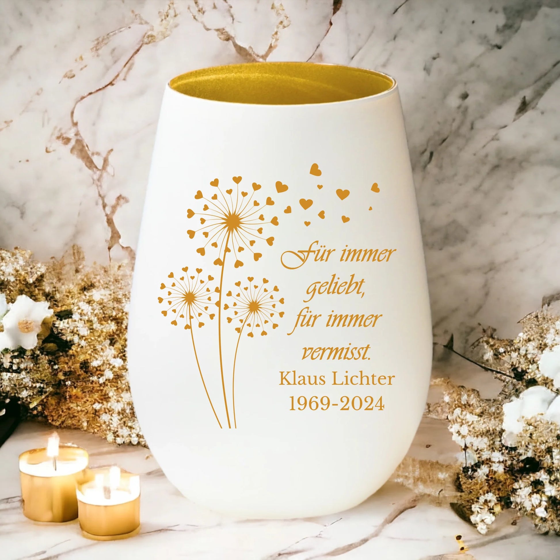 Durch die Beleuchtung wird die Innenfarbe des Windlichtes hervorgehoben. So scheint die Schrift dann golden.